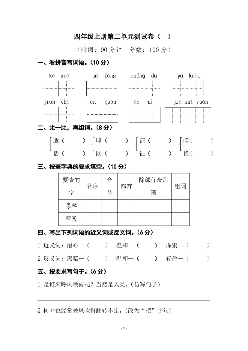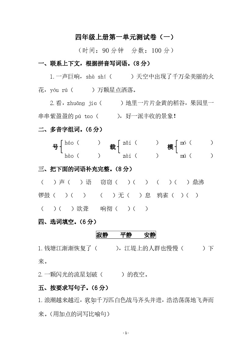 【语文】四上第一单元检测试卷(一)