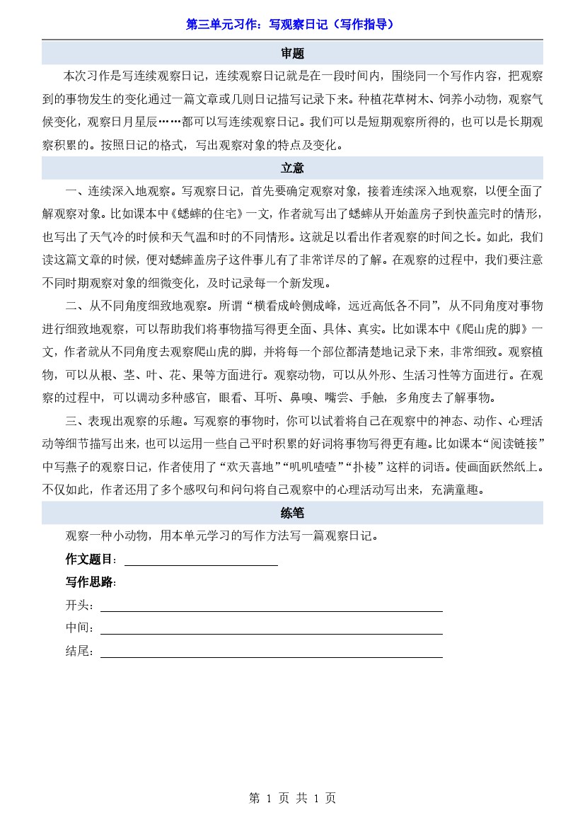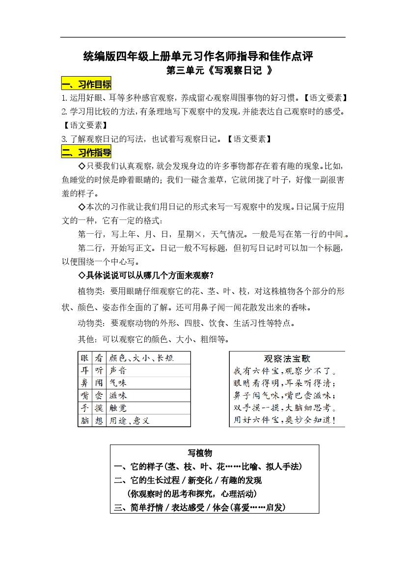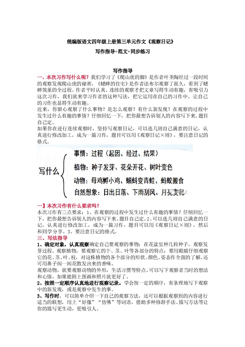 编版语文四年级上册第三单元作文《观察日记》写作指导+范文+同步练习