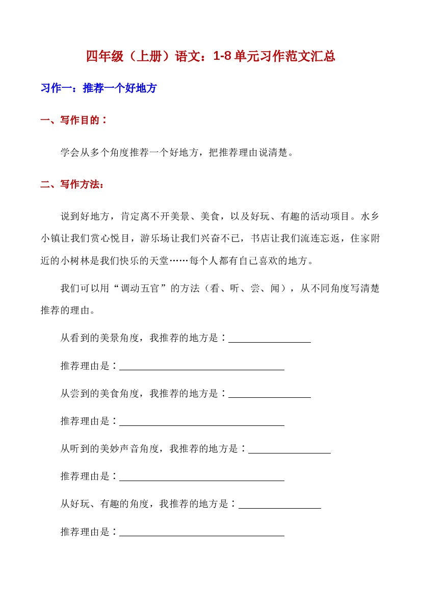 四上语文1-8单元习作写作指导及范文