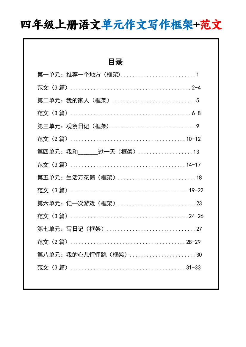 四年级(上)语文1-8单元作文写作框架+范文