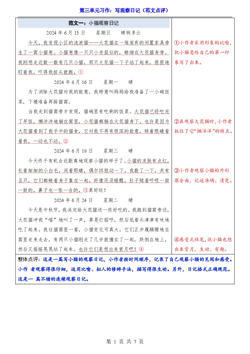 25年秋【四上语文】第3单元习作《写观察日记》(范文点评)