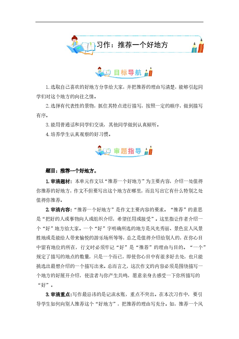 人教部编版四年级语文上册第1单元同步作文:推荐一个好地方-写作指导+范文赏析+病文升格-部编版语文四年级上册