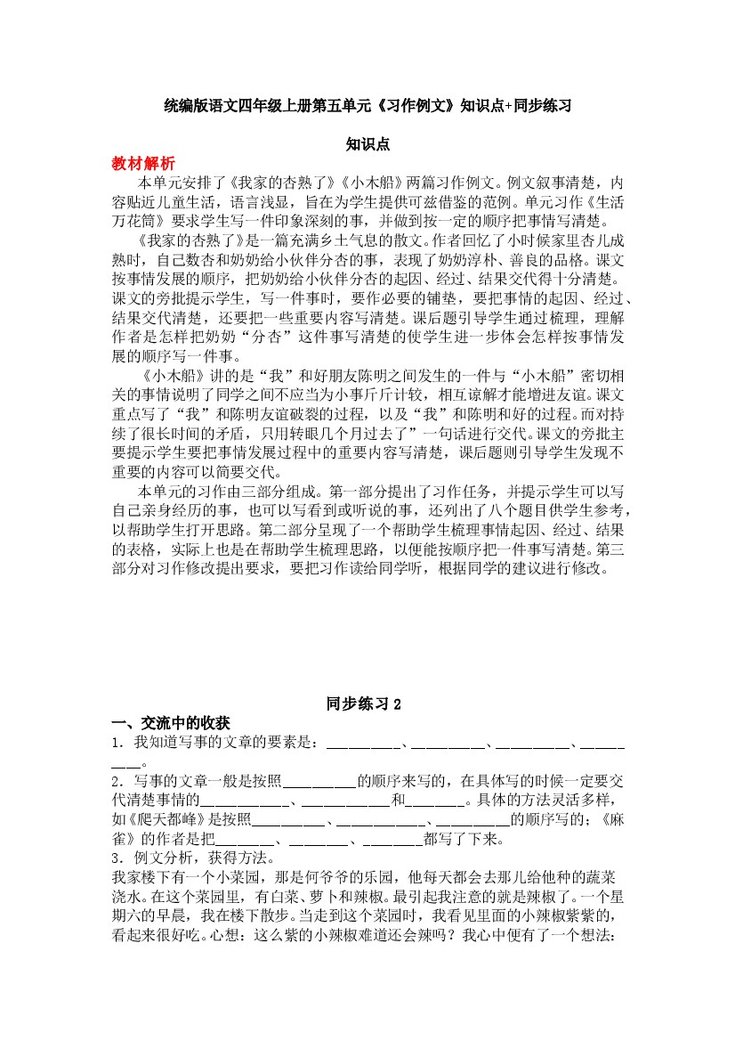 统编版语文四年级上册第五单元《习作例文》知识点+同步 练习