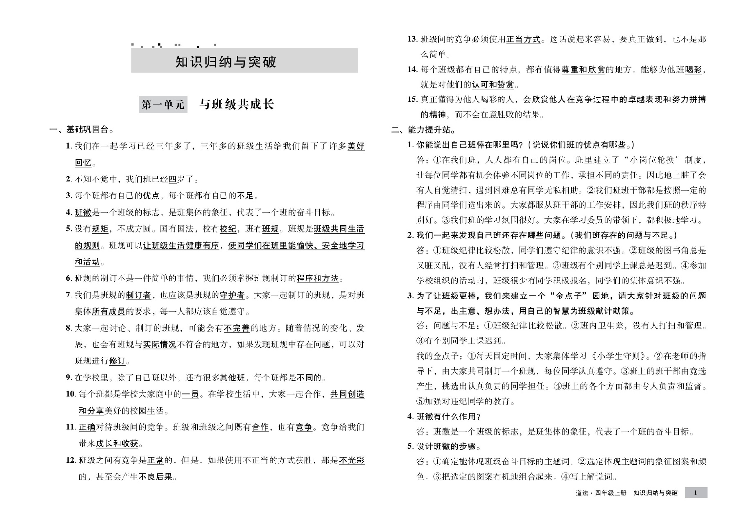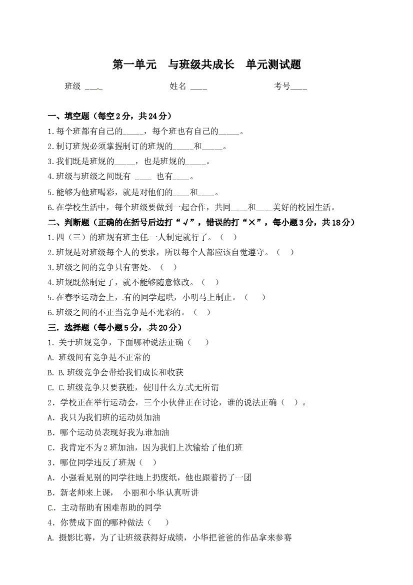 【精品】四上道法单元测试-第一单元 与班级共成长 人教部编版(含答案)