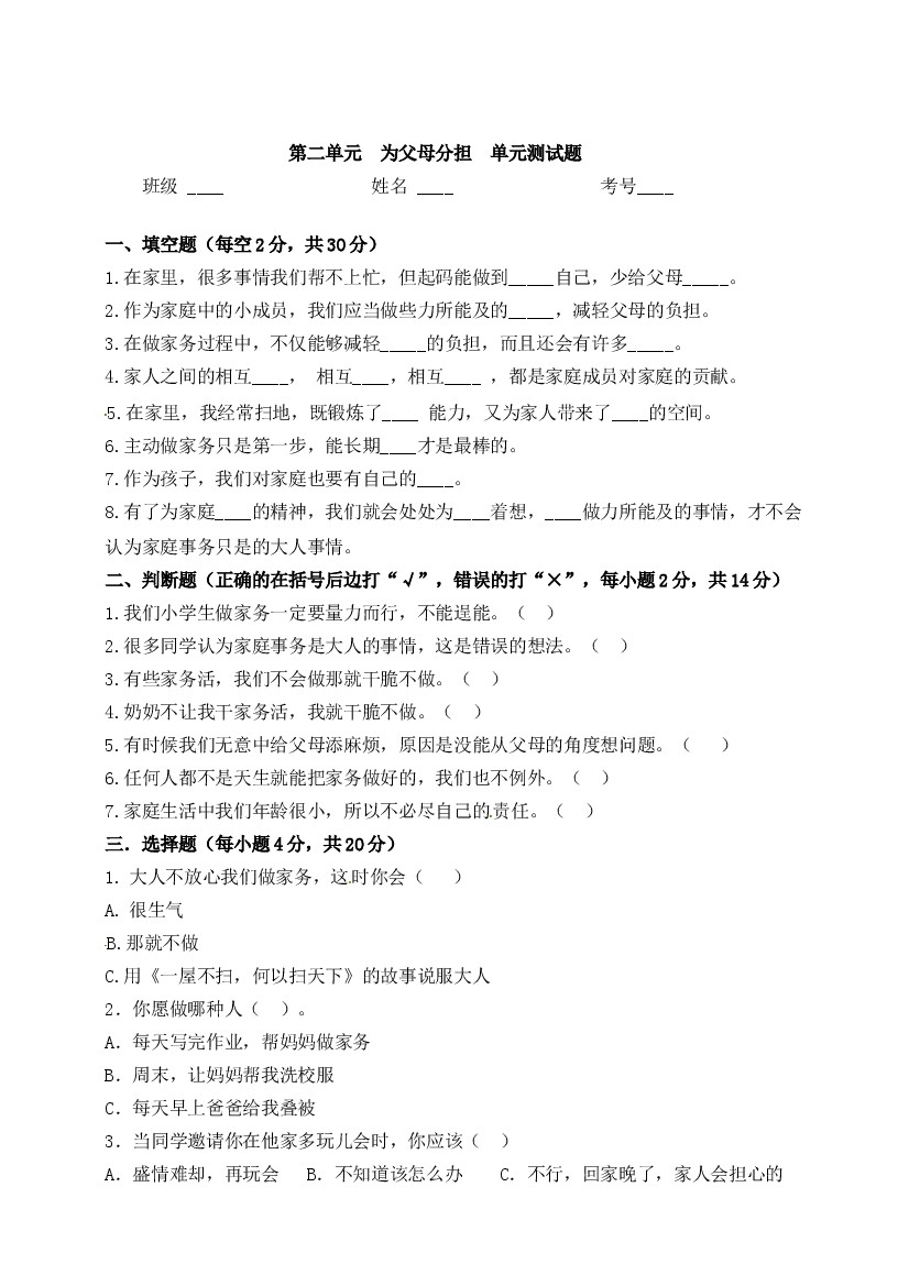 【精品】四上道法单元测试-第二单元 为父母分担 人教部编版(含答案)