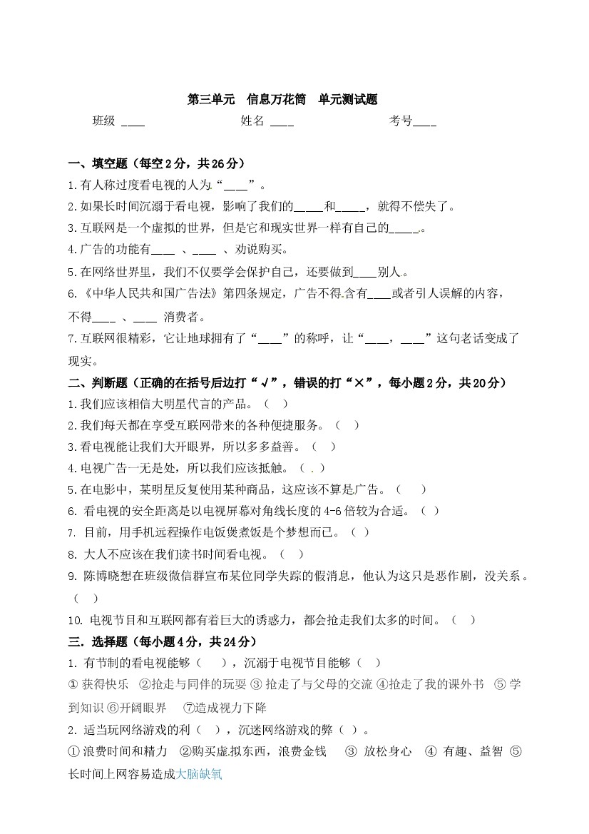 【精品】四上道法单元测试-第三单元 信息万花筒 人教部编版(含答案)