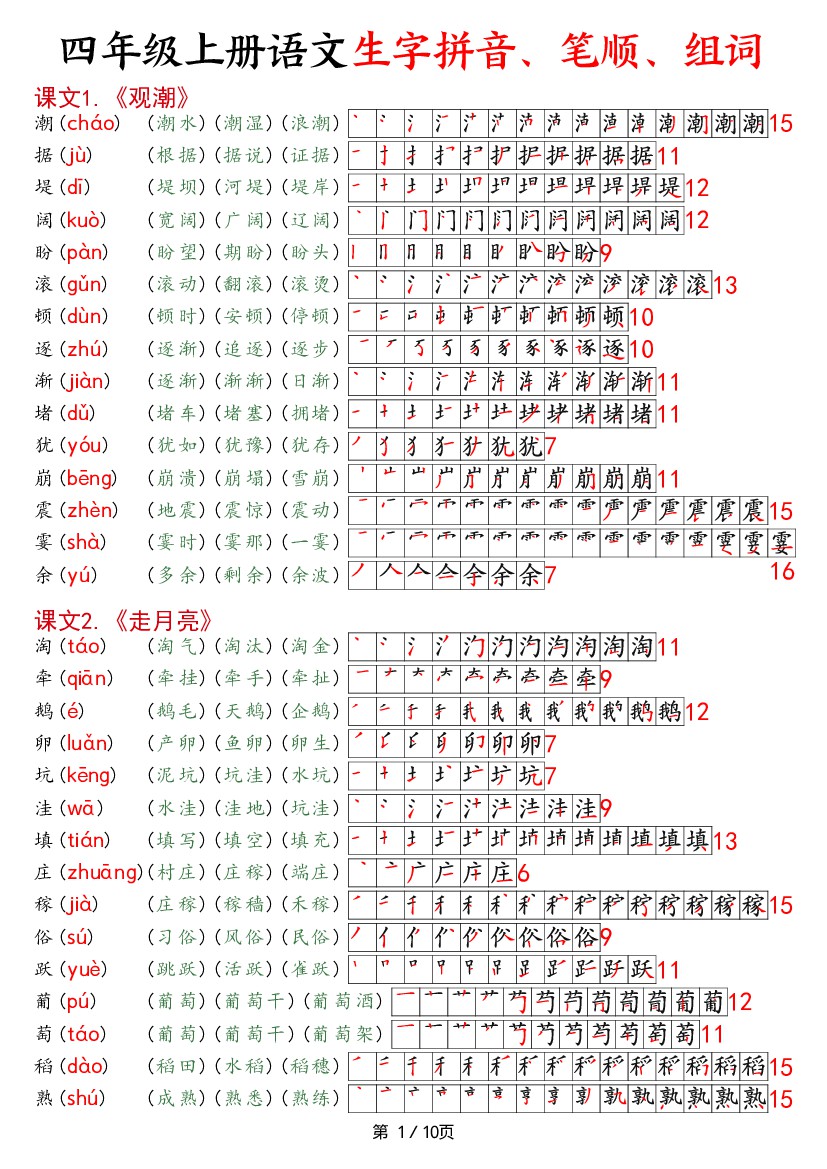 四年级上册语文生字拼音、笔顺、组词(10页)