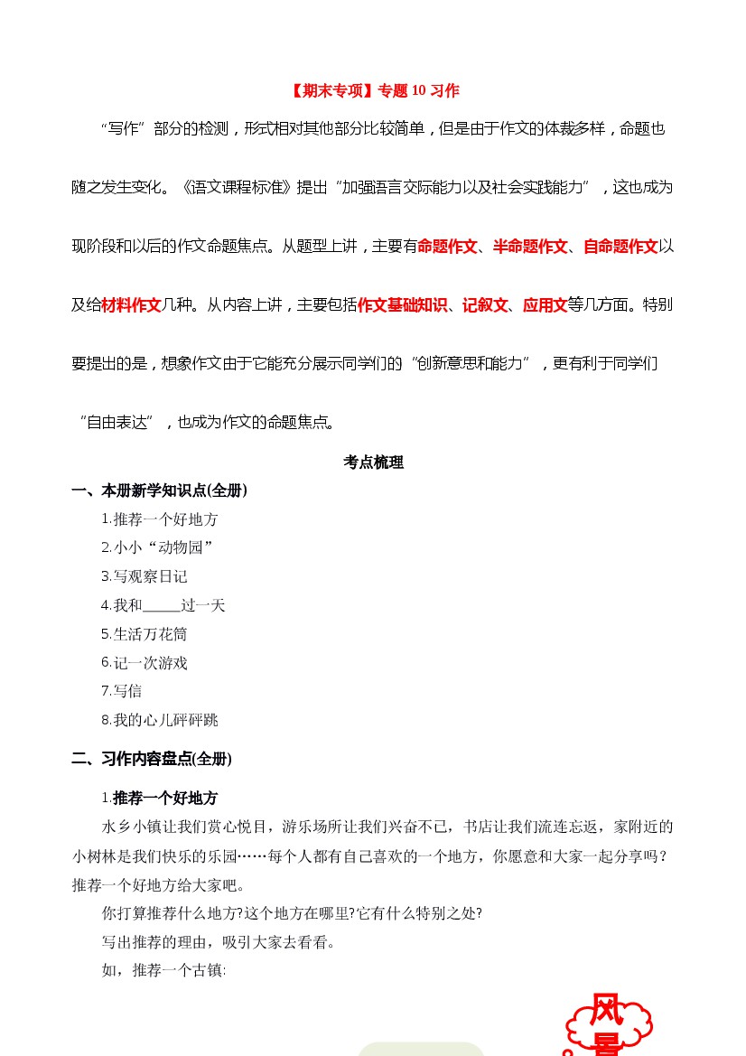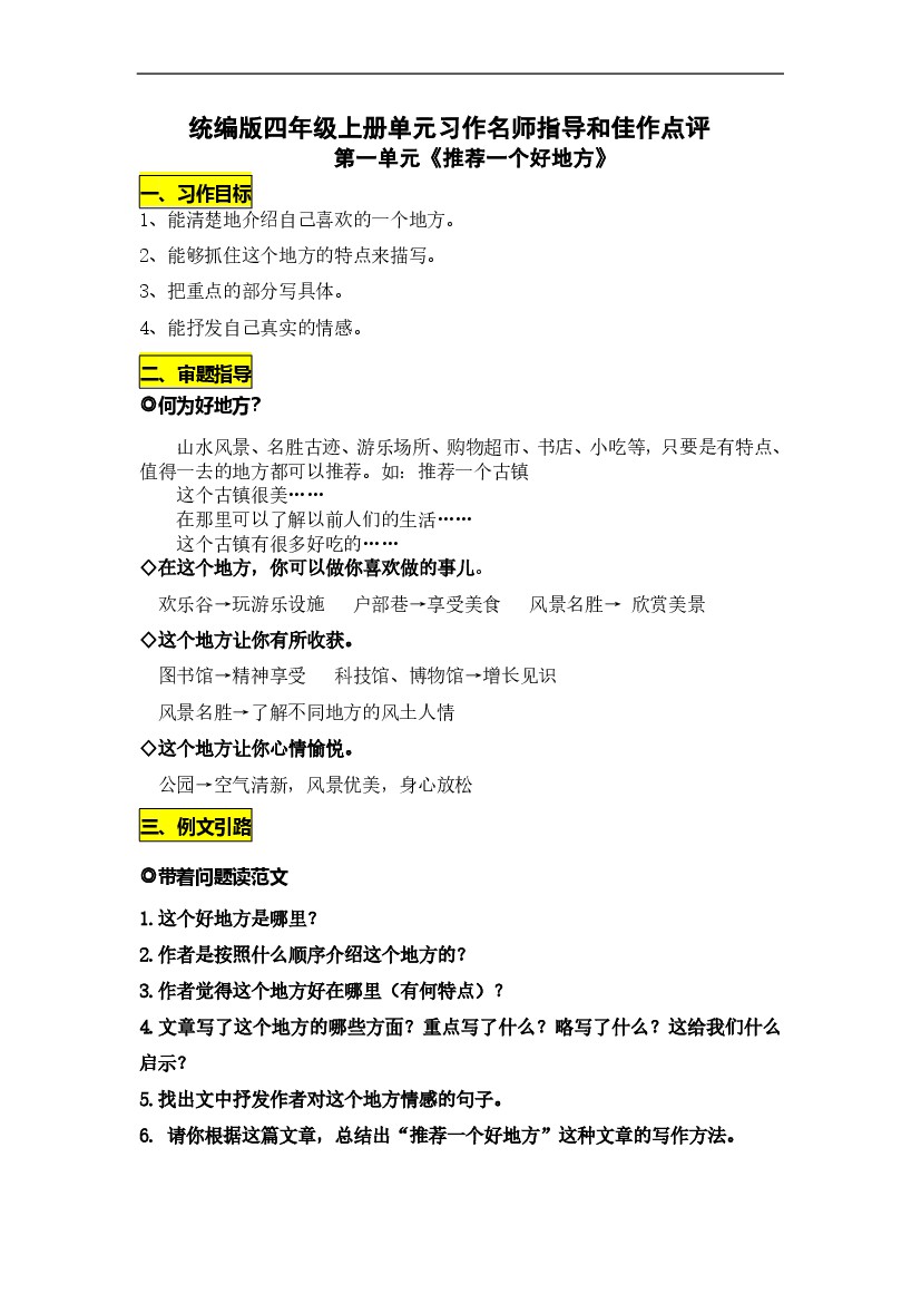 人教部编版四年级语文上册第1单元习作《推荐一个好地方》名师指导和佳作点评(10篇)