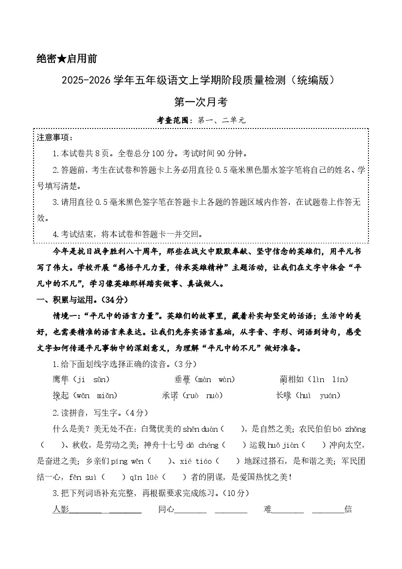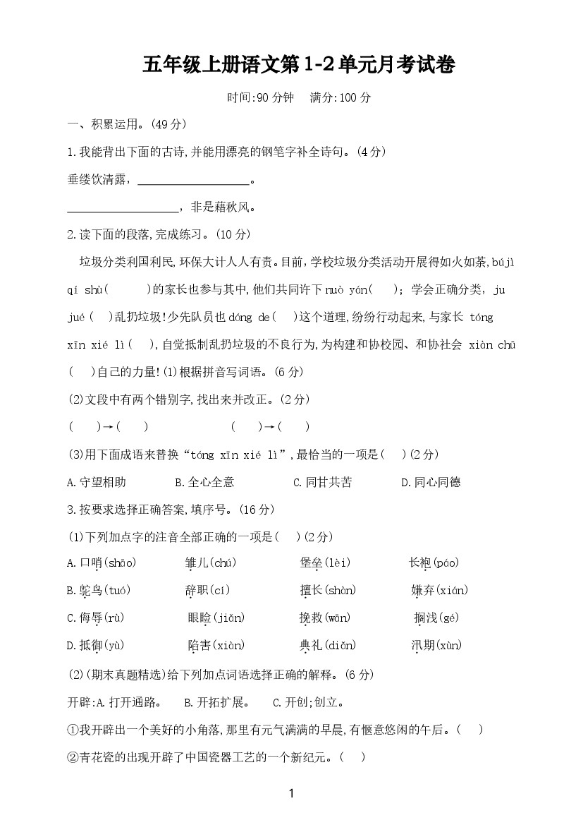 五年级上册语文第1-2单元月考阶段测试(附答案6页)