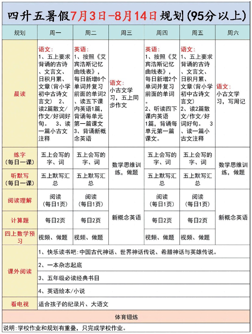四升五暑假计划表