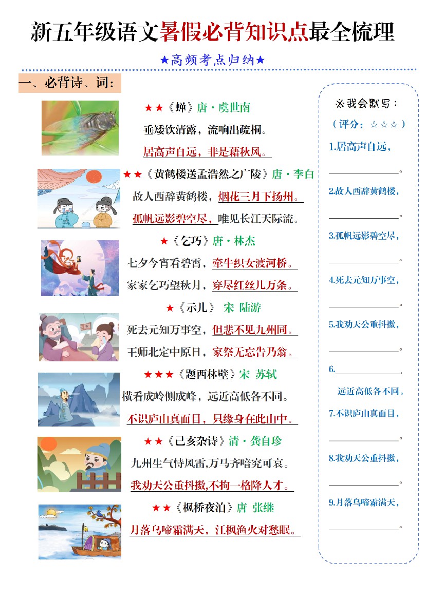 五年级语文暑假必背知识点梳理(高频考点归纳)5页-五上语文