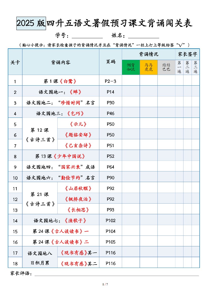 四升五语文暑假预习课文背诵闯关表