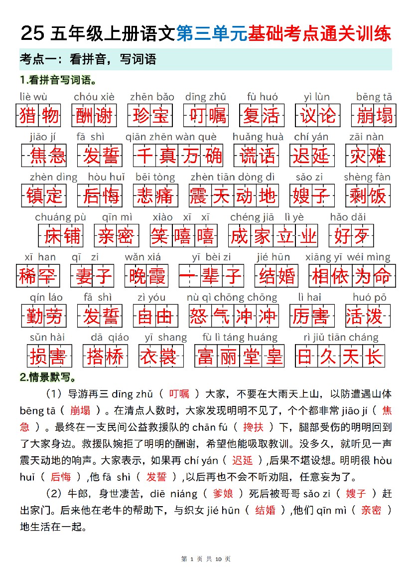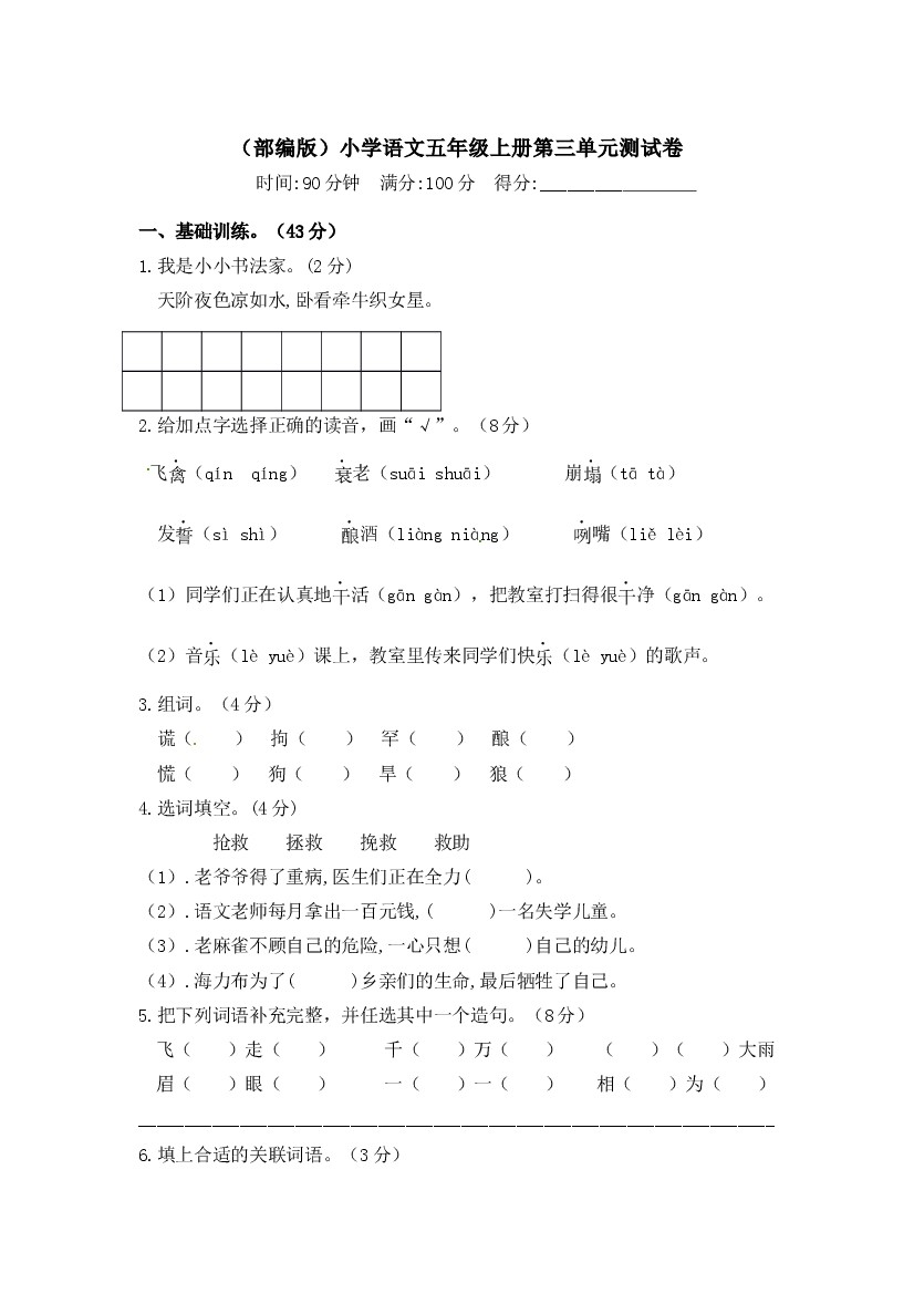【精品】人教部编版五年级上册语文 第三单元测试卷 含答案