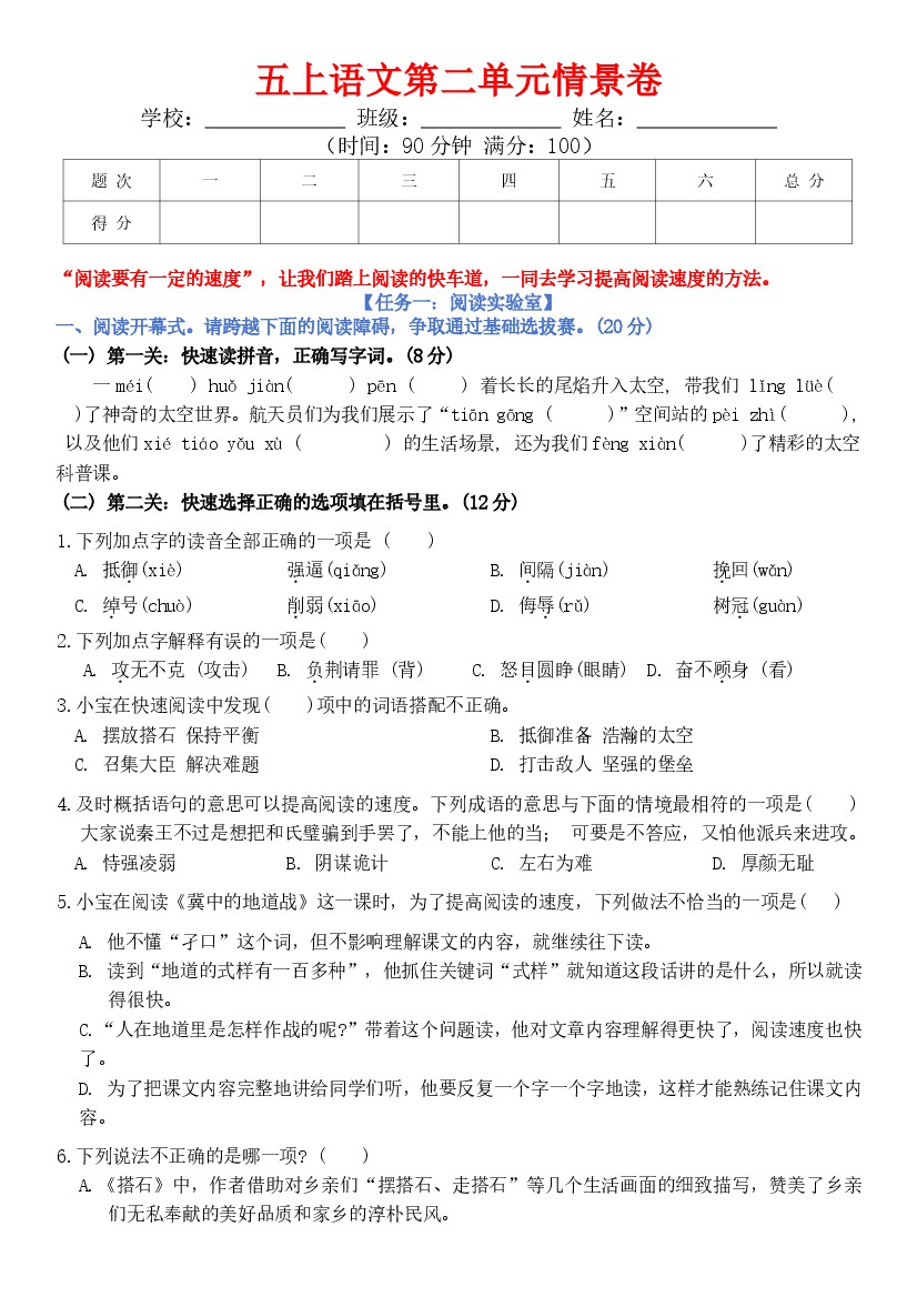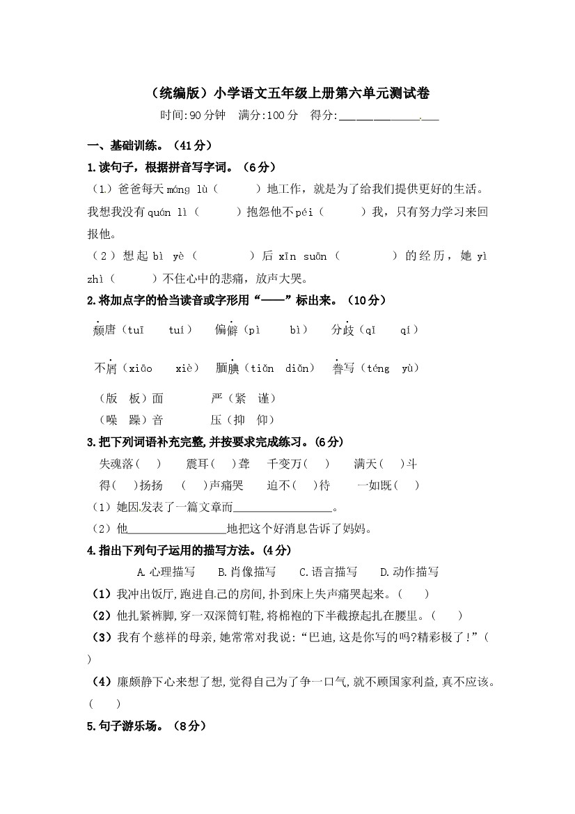 【精品】人教统编版五年级上册语文第六单元测试卷 含答案