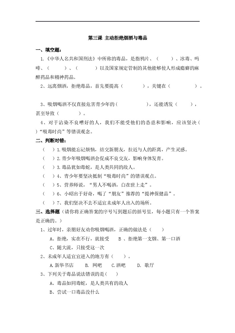 【一课一练】第三课 主动拒绝烟酒与毒品 五年级上册道德与法治 人教部编版(含答案)