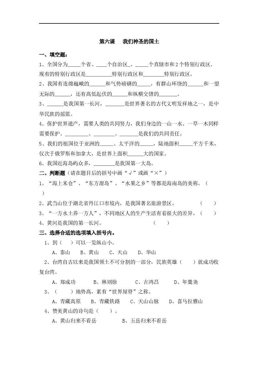 【一课一练】第六课 我们神圣的国土 五年级上册道德与法治 人教部编版(含答案)