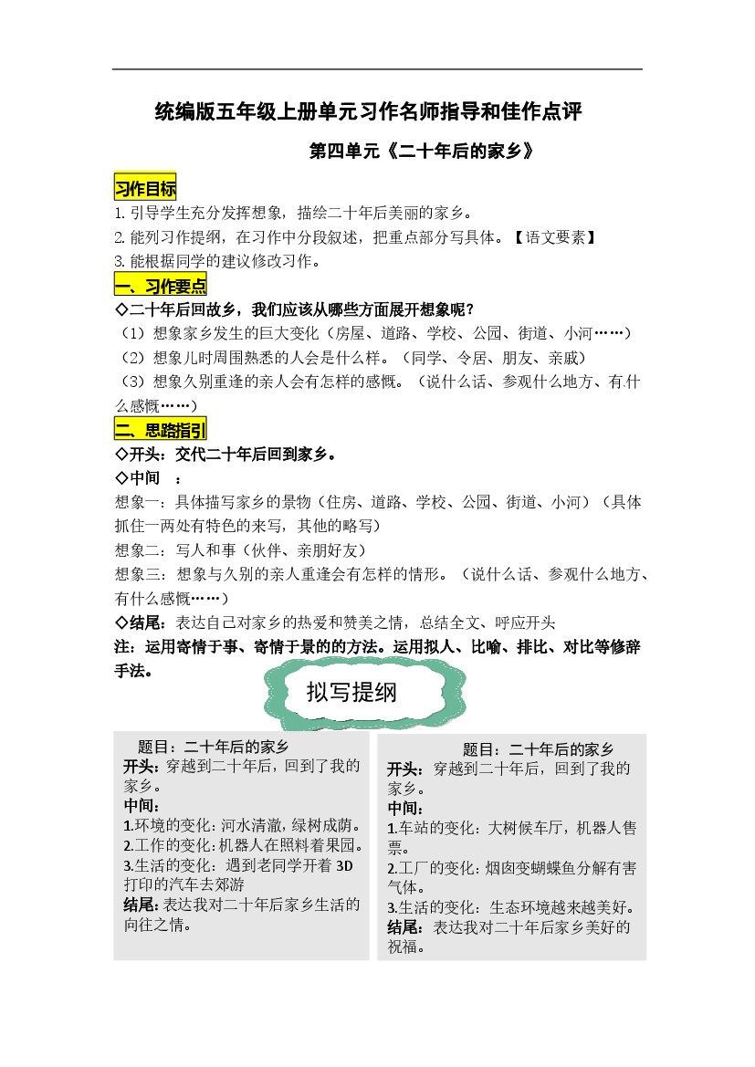 人教部编版五年级语文上册第4单元习作《二十年后的家乡》名师指导和佳作点评(10篇)