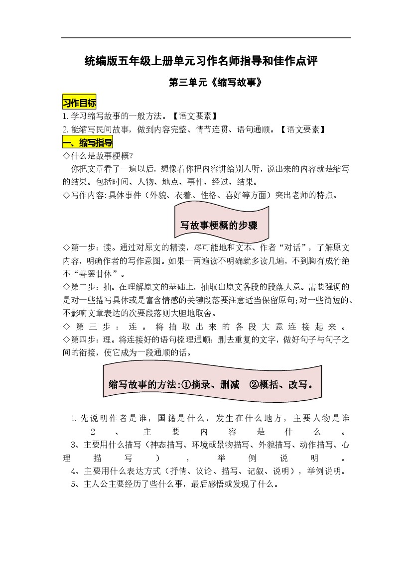 人教部编版五年级语文上册第3单元习作《缩写故事》名师指导和佳作点评(10篇)