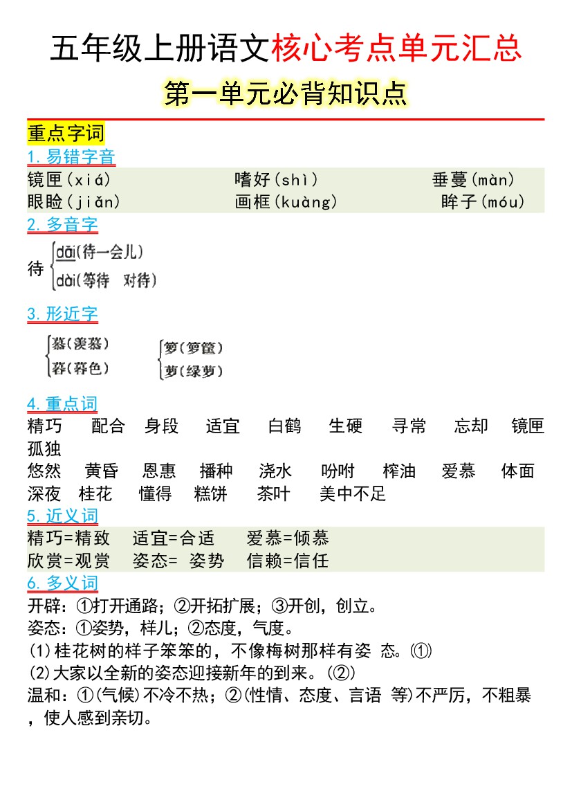 【1-8单元必考知识汇总】五年级语文知识点