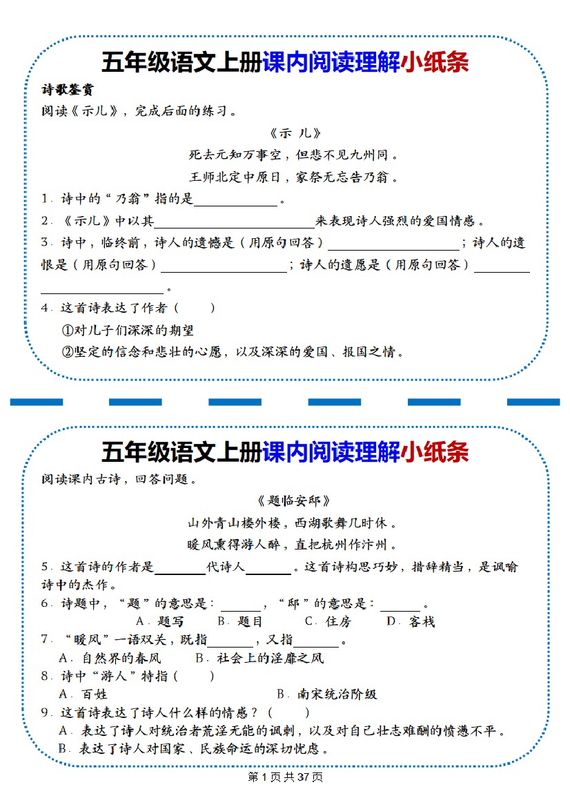 五上丨语文 课内阅读理解小纸条(59篇)