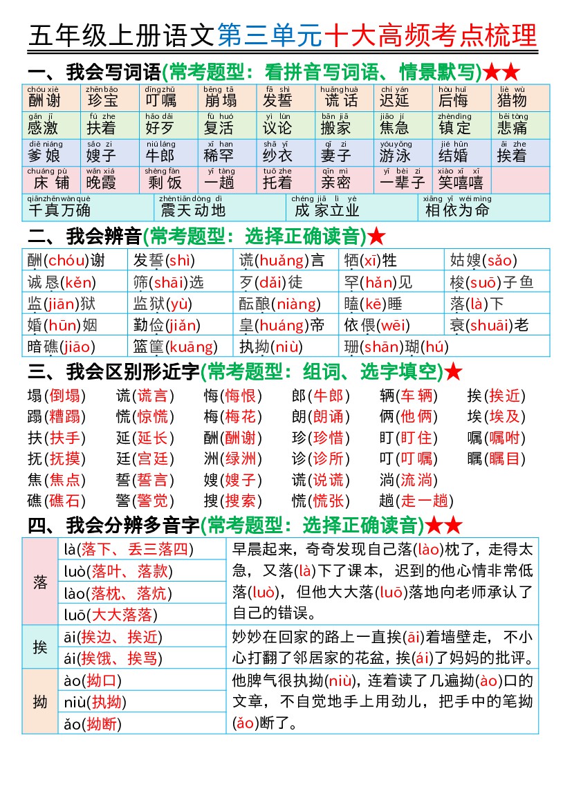 五年级上册语文第三四单元十大高频考点梳理