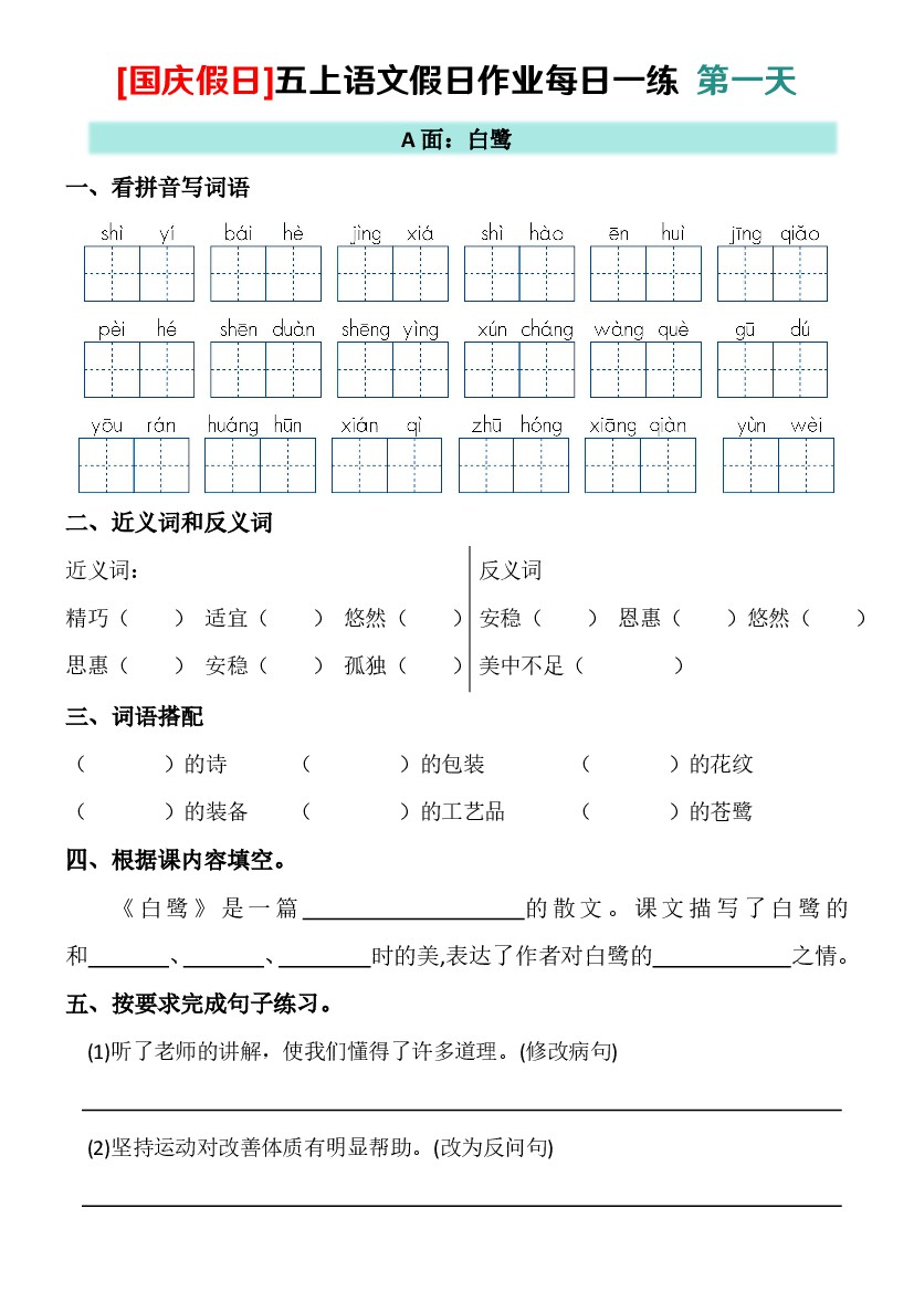 25秋新五上语文国庆假期作业(1)