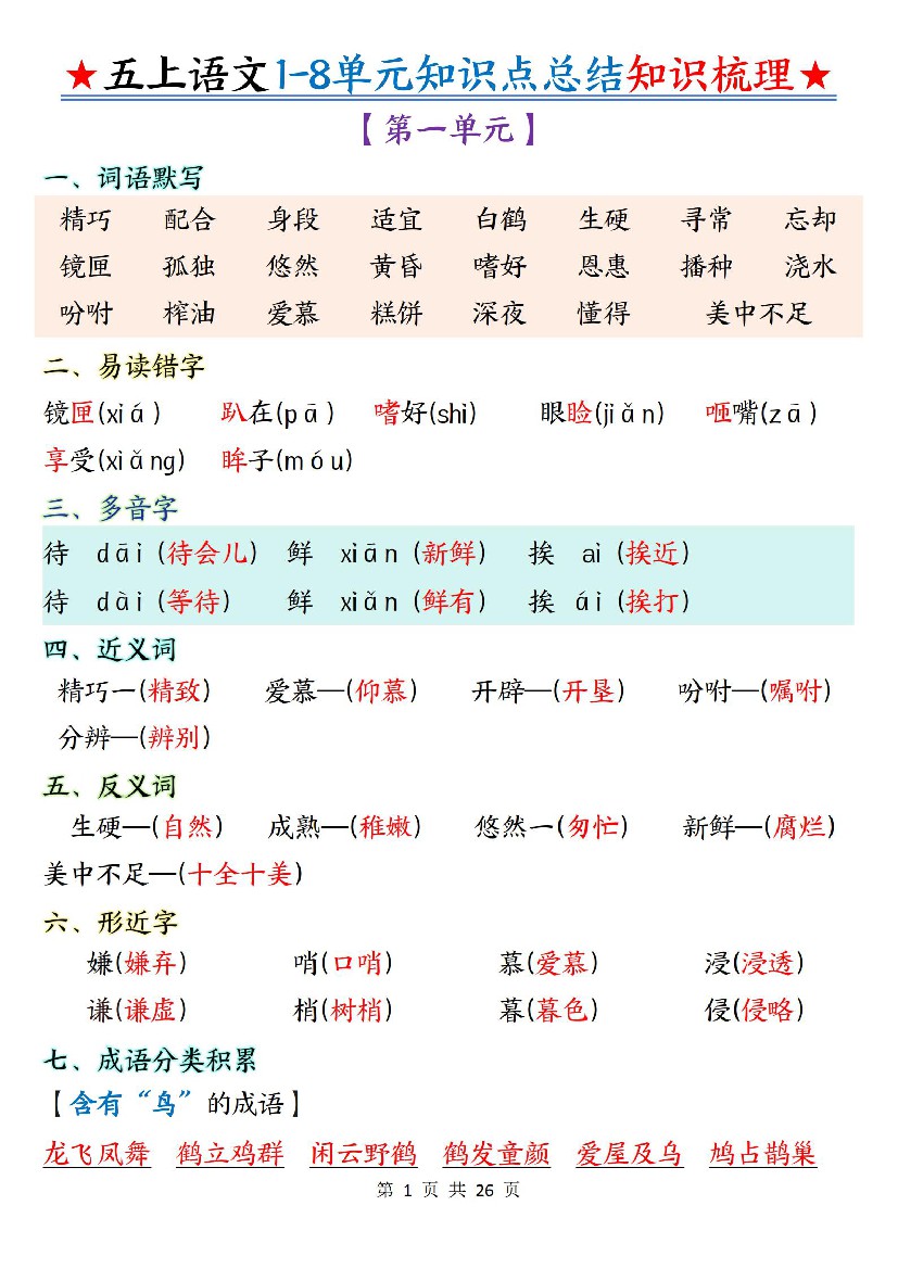 五上语文1-8单元知识点总结知识梳理26页