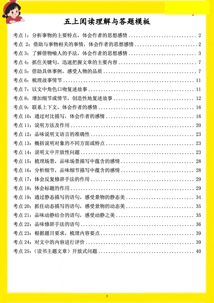 五上语文【阅读理解与答题模板(含答案)】
