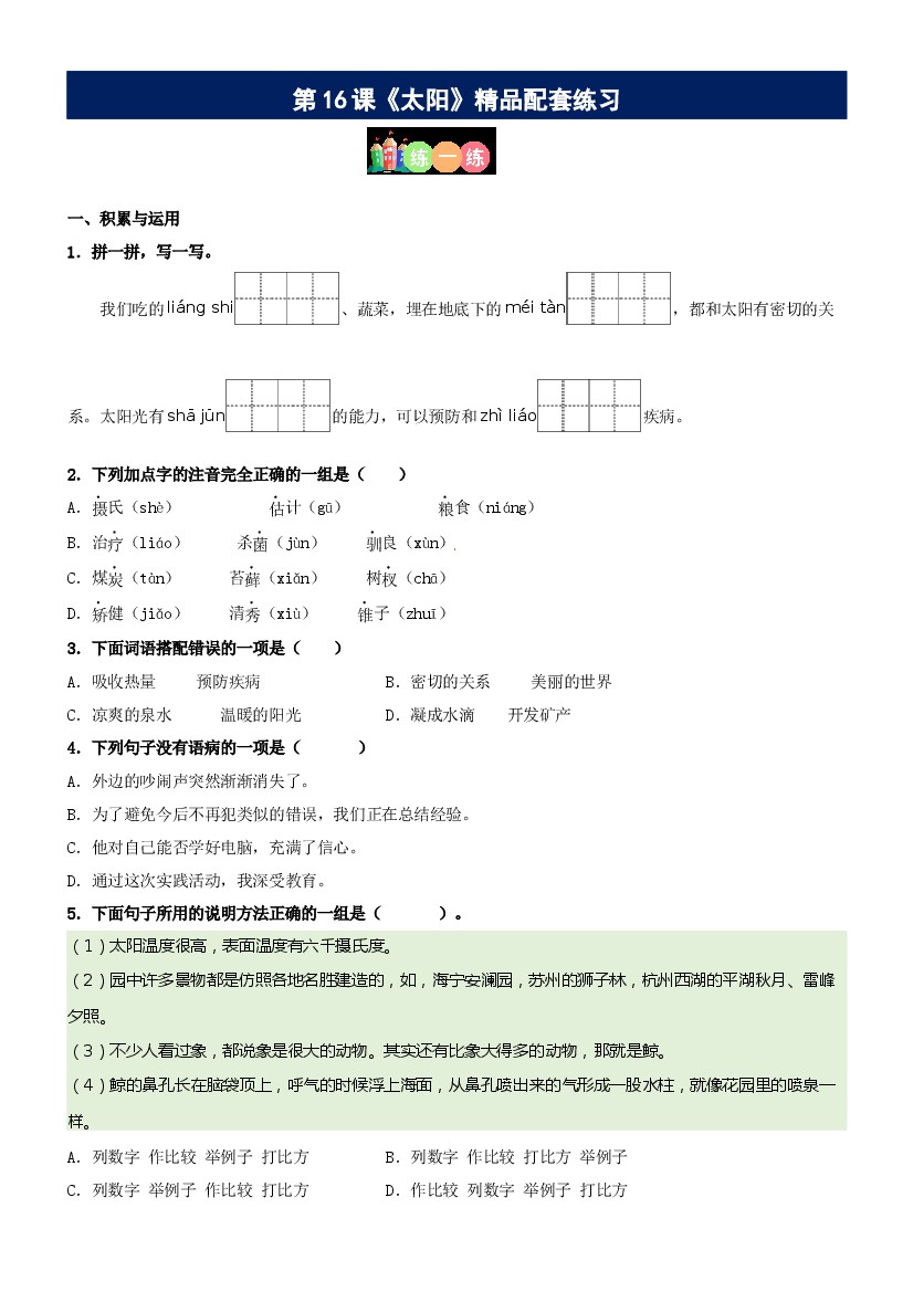 第16课《太阳》精品配套练习(基础+阅读)-部编版五年级上册