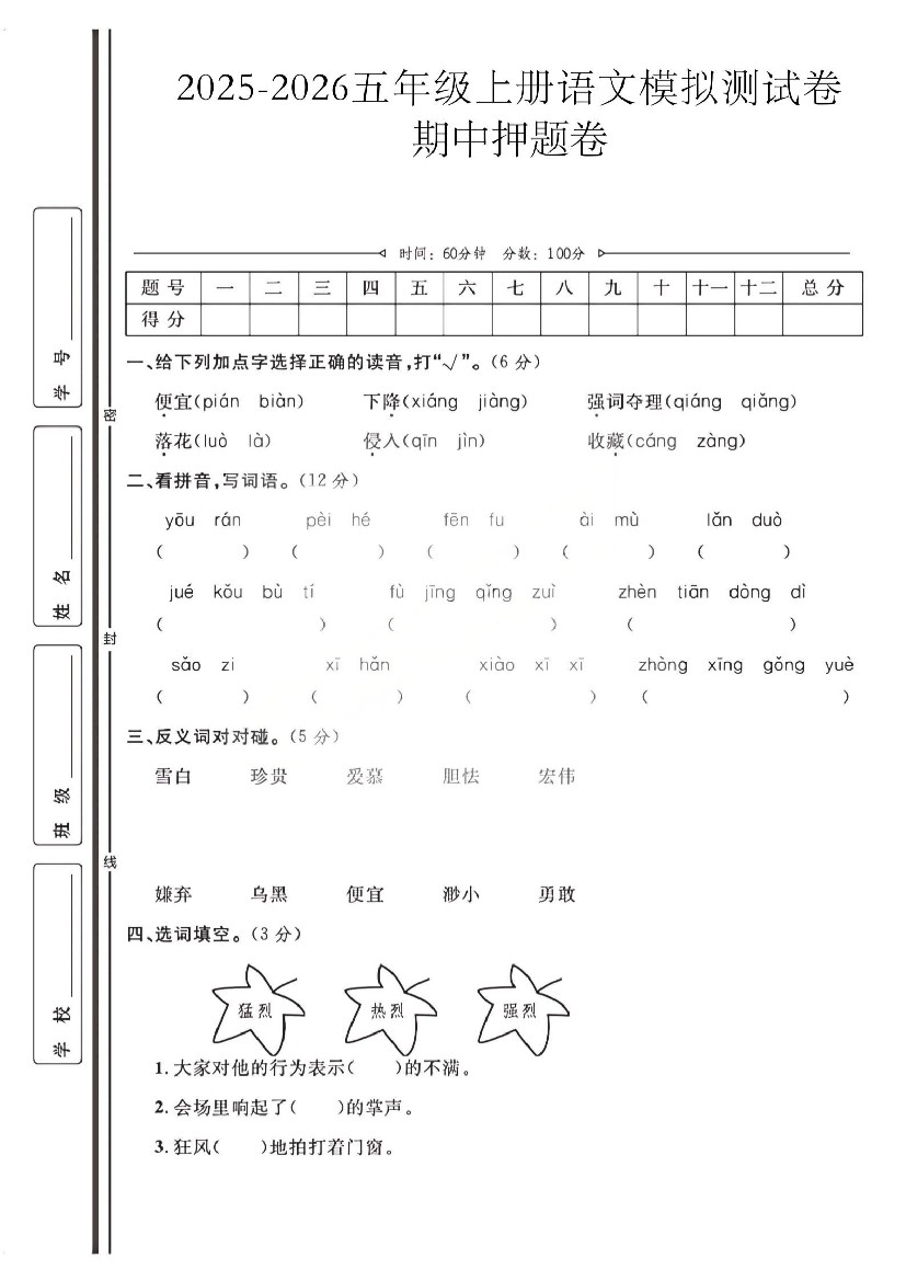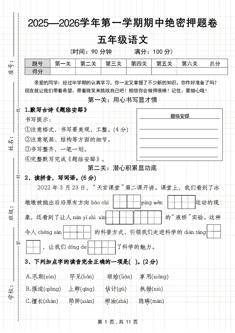 25-26五上语文第一学期期中绝密押题卷(含答案11页)