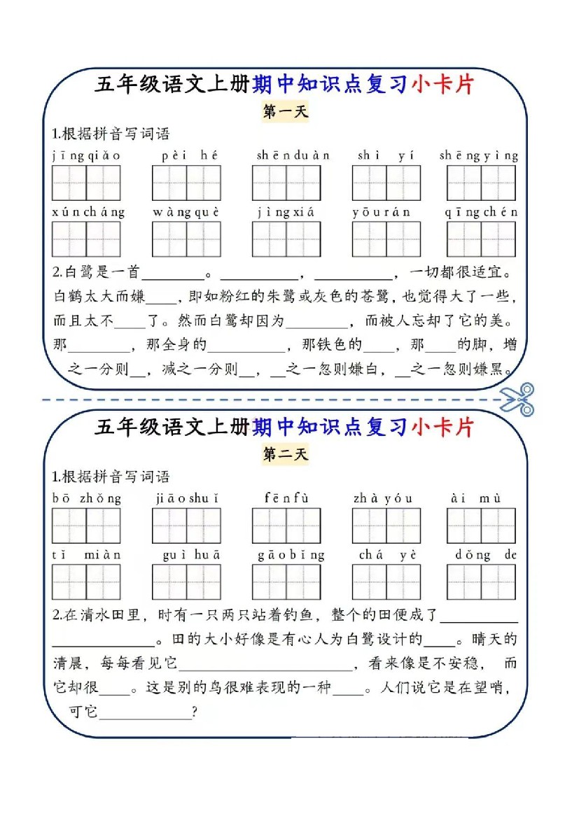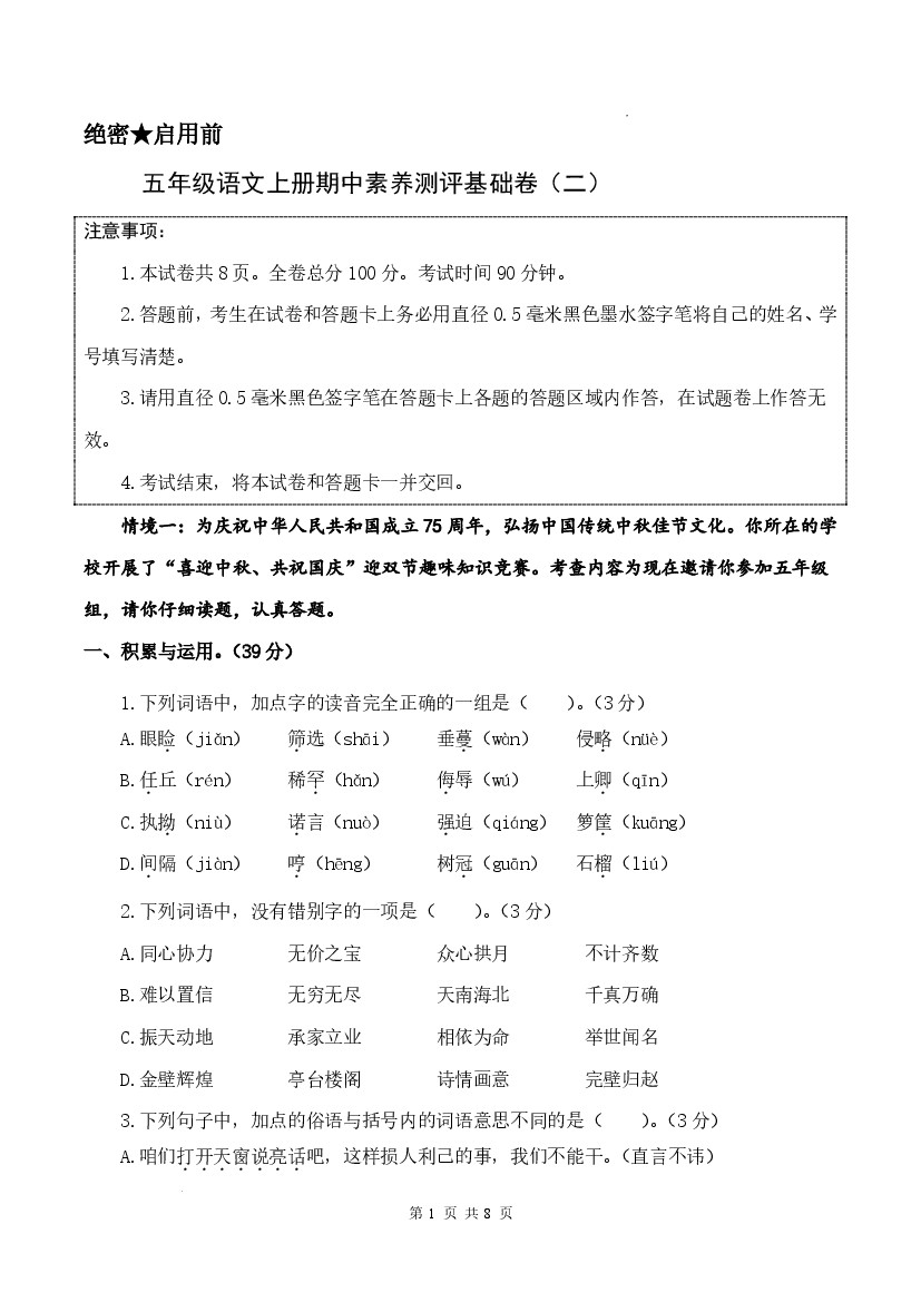 五上语文期中素养测评基础卷二(试卷+答题卡+答案解析26页)
