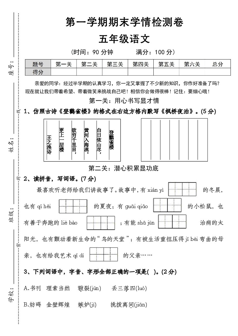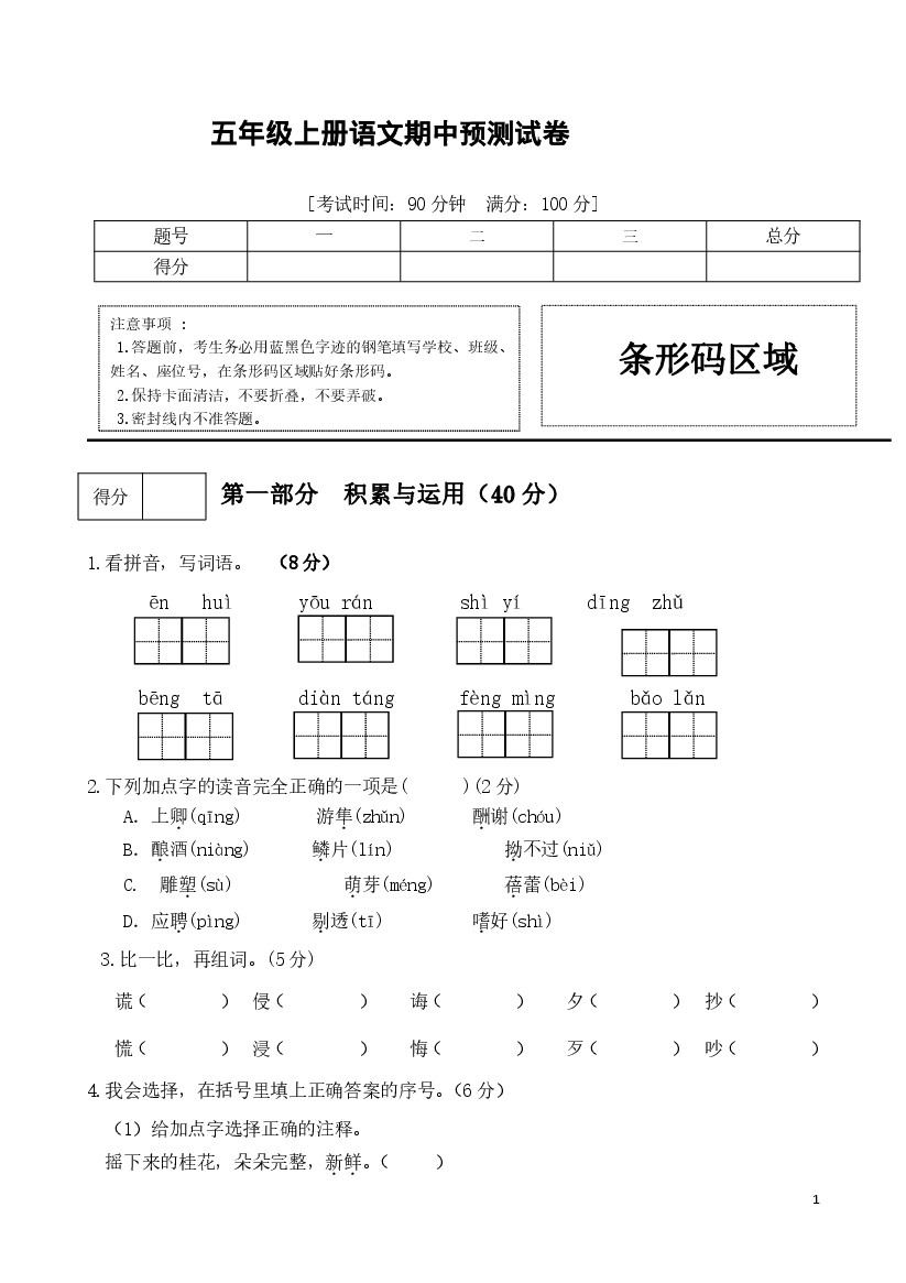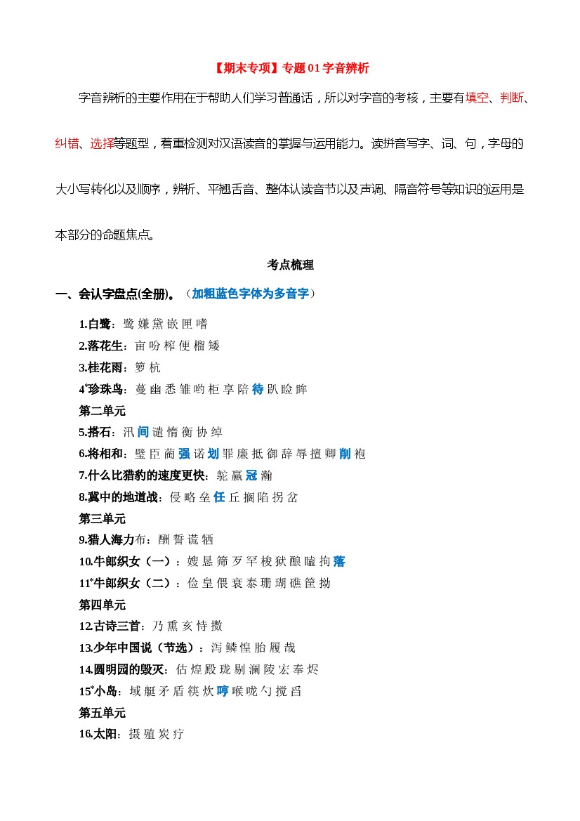 五年级上册语文期末专题复习-(1)--专题01 字音辨析