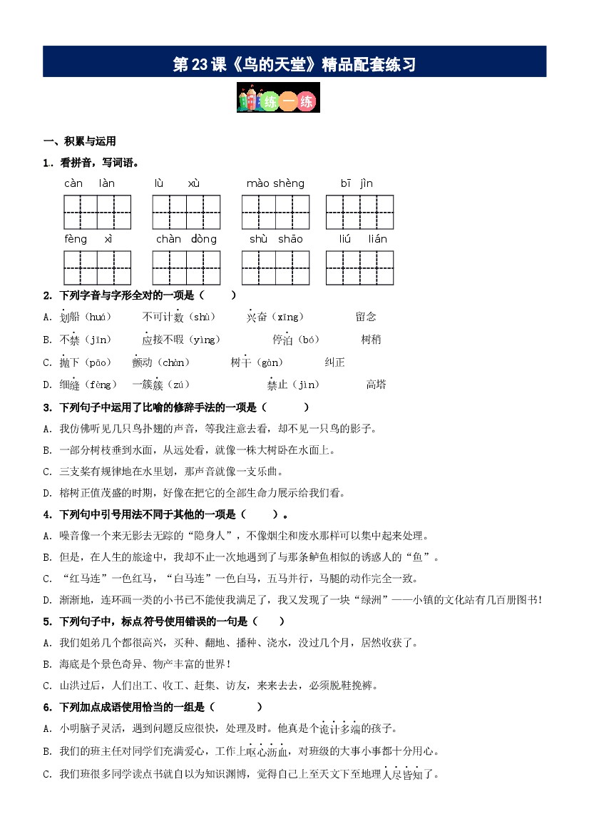 第23课《鸟的天堂》精品配套练习(基础+阅读)-部编版五年级上册