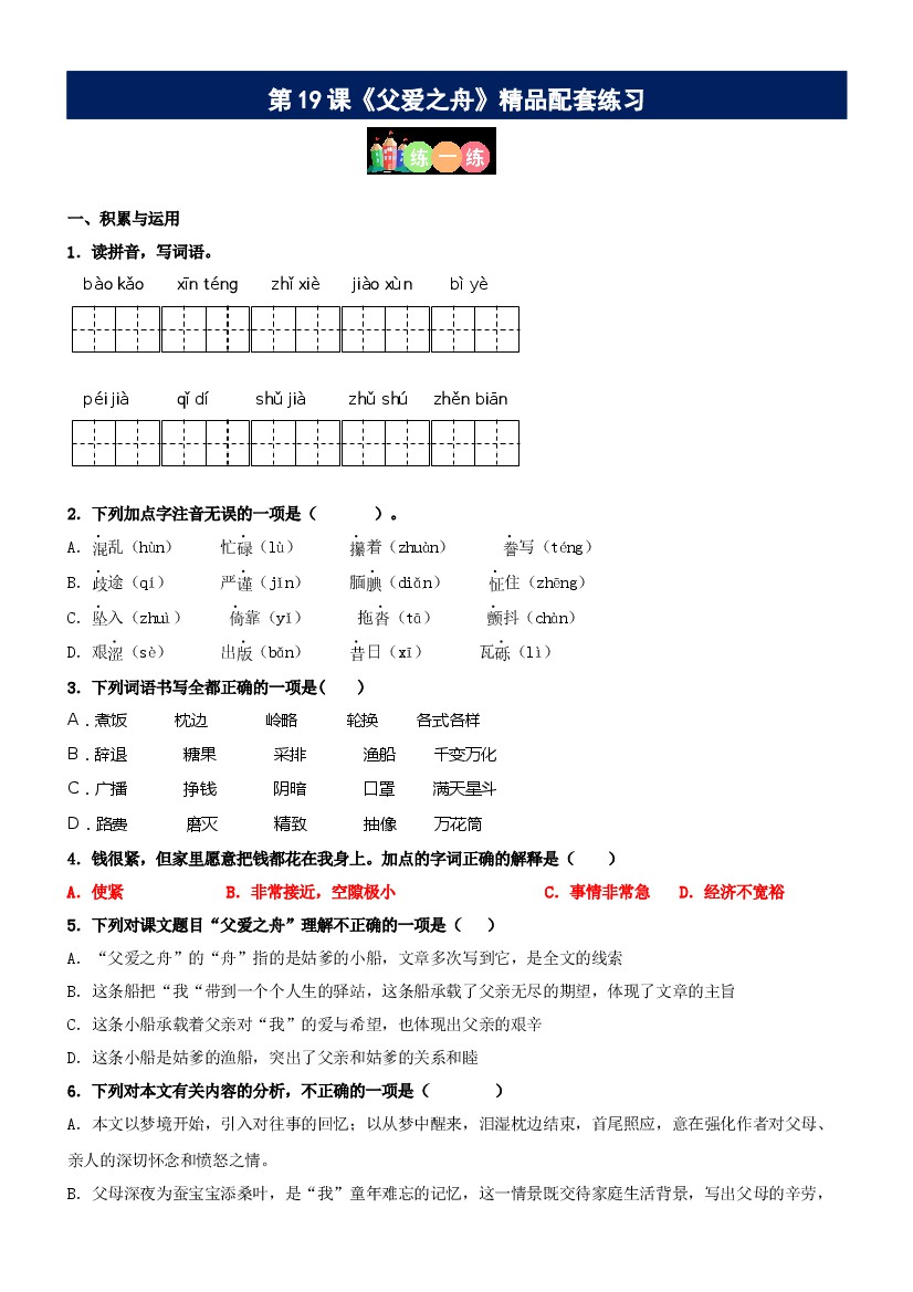 第19课《父爱之舟》精品配套练习(基础+阅读)-部编版五年级上册