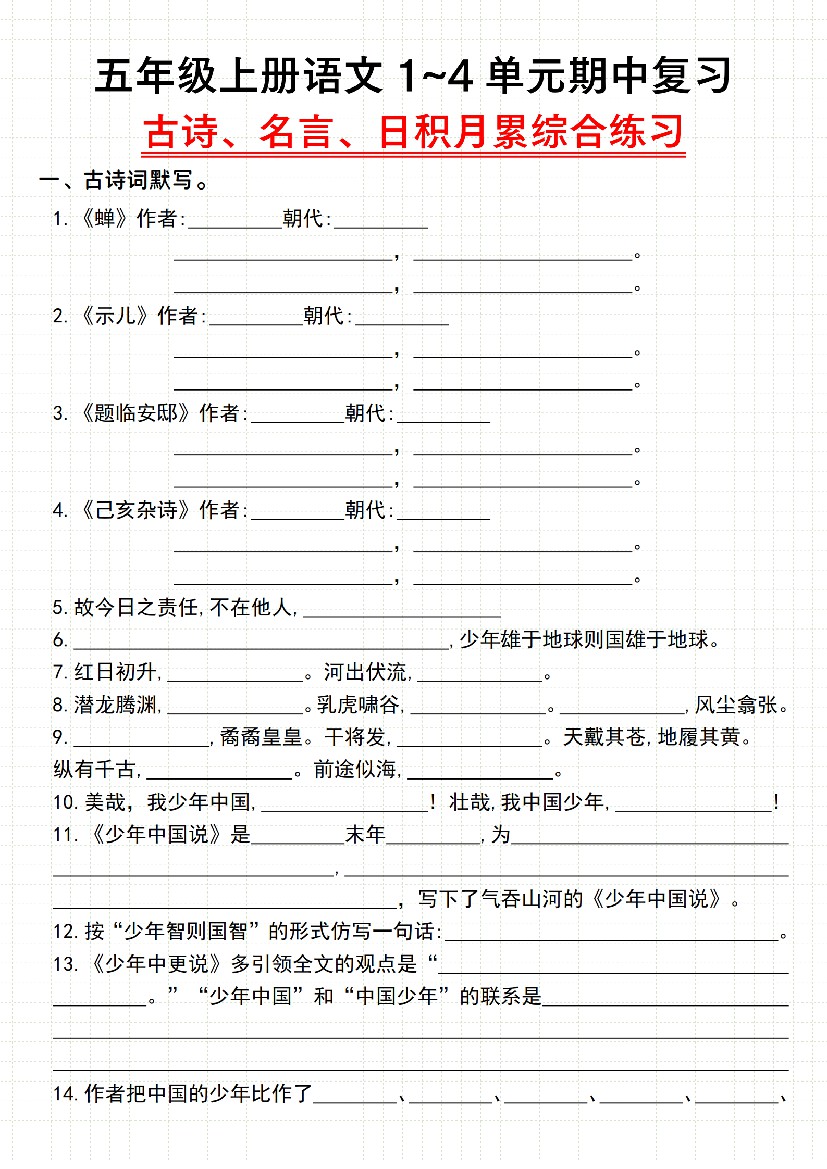《语文五年级上册语文1~4单元期中复习古诗、名言、日积月累综合练习》_