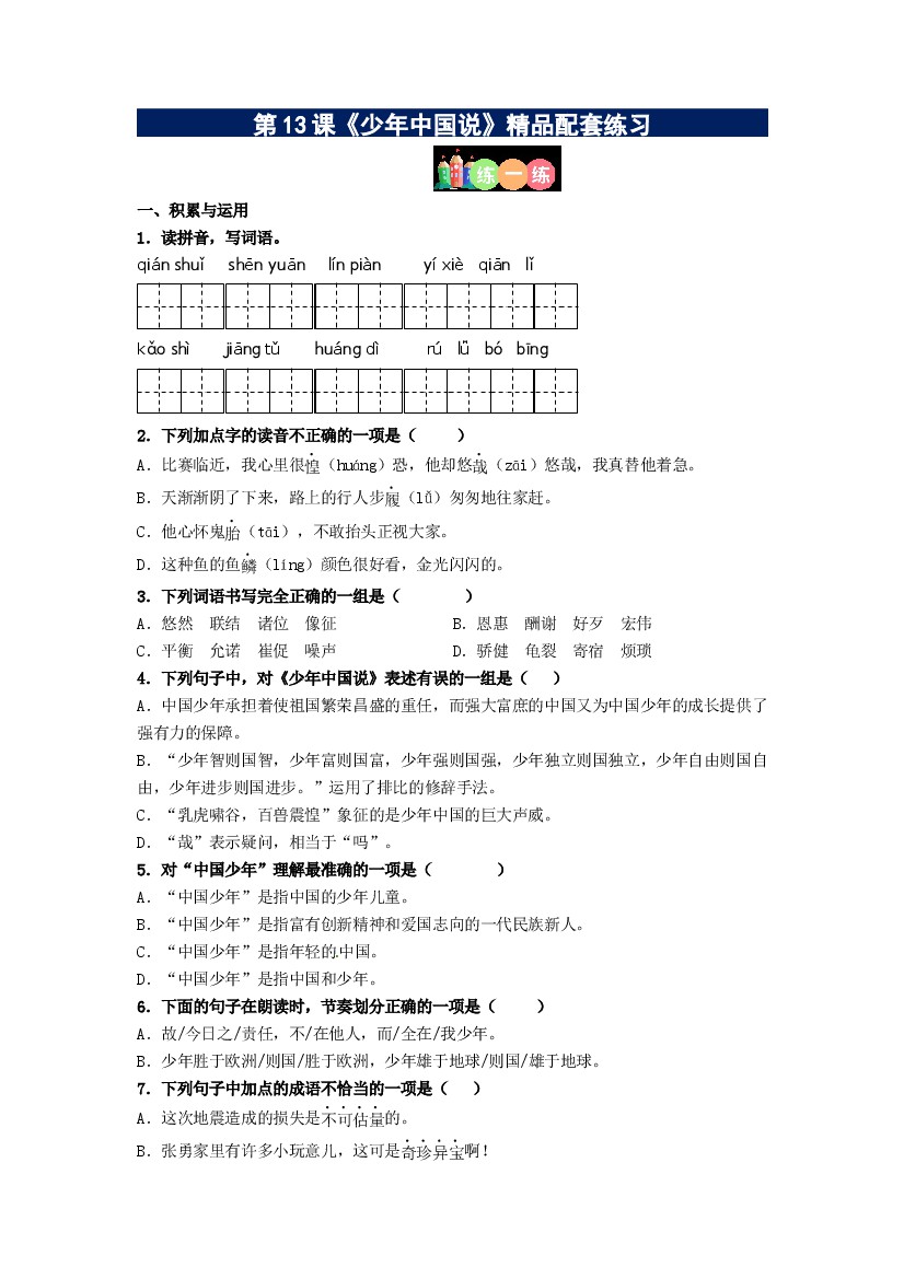 第13课《少年中国说》精品配套练习(基础+阅读)-部编版五年级上册