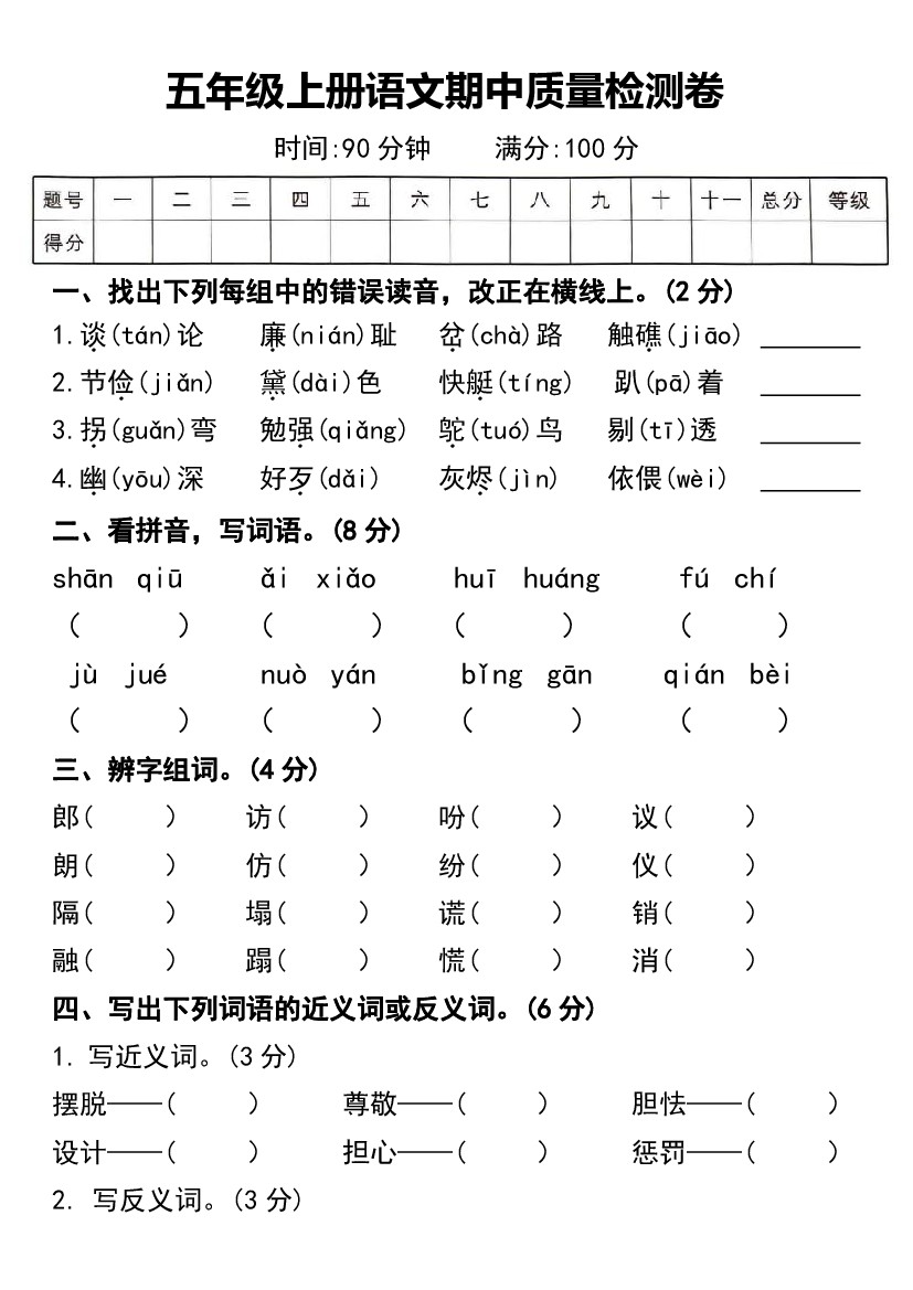 五上语文期中素养测评提高卷二(试卷+答题卡+答案解析28页)