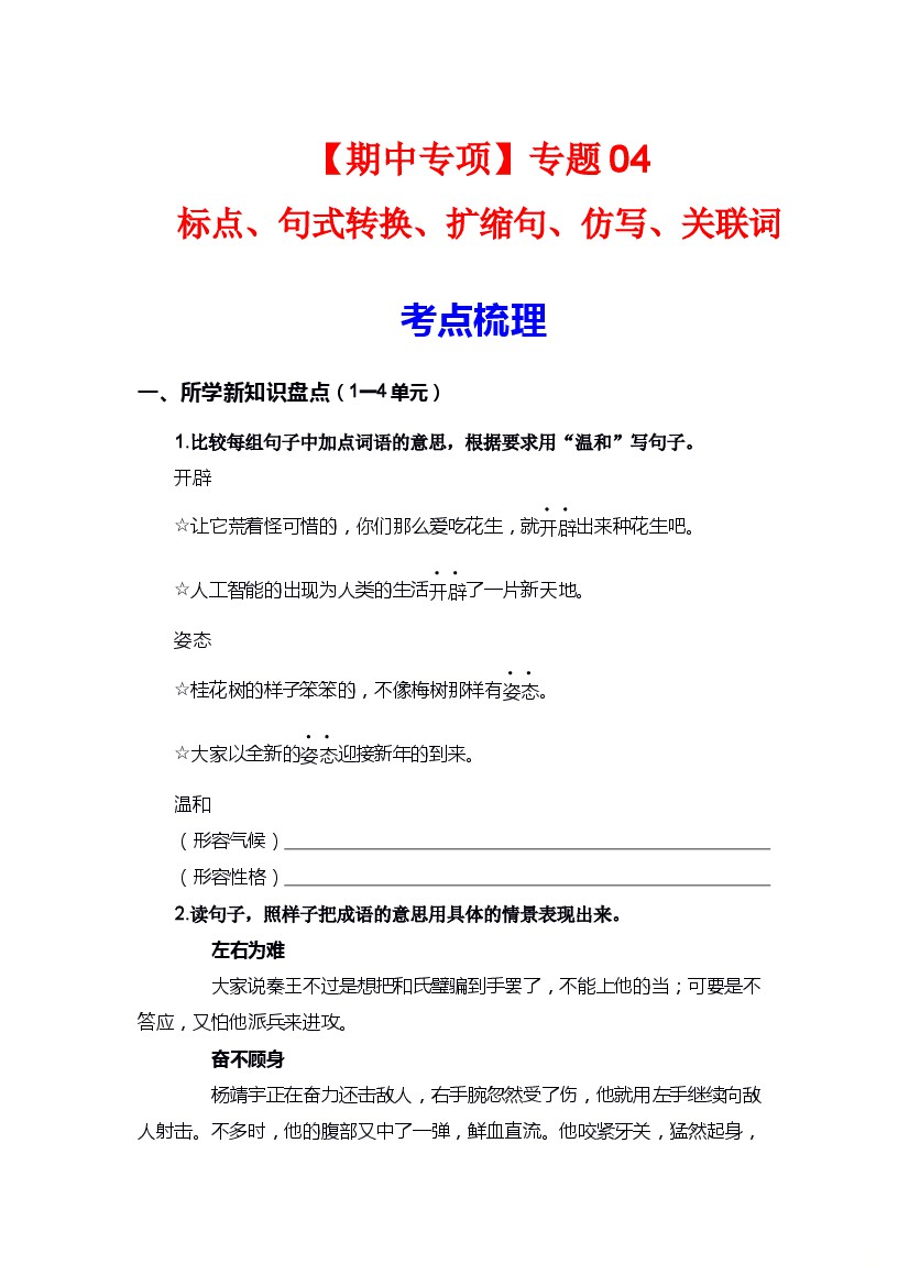 专题 04标点、句式转换、扩缩句、仿写、关联词(考点+试题)-2023-2024学年五年级语文上册期中专项复习(统编版)