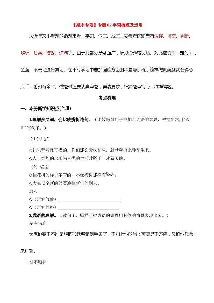 五年级上册语文期末专题复习-(2)--专题02 字词梳理及运用