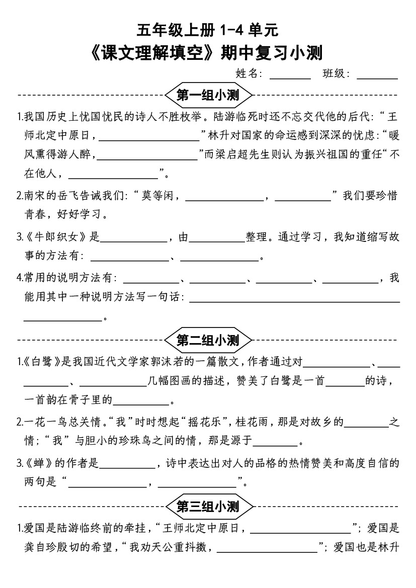 【按课文内容填空】五年级上册语文1-4单元期中复习小测-含答案
