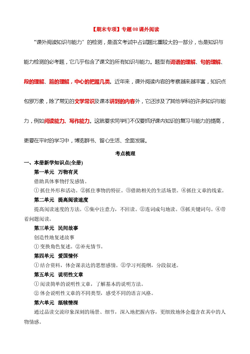 五年级上册语文期末专题复习-(8)--专题08 课外阅读