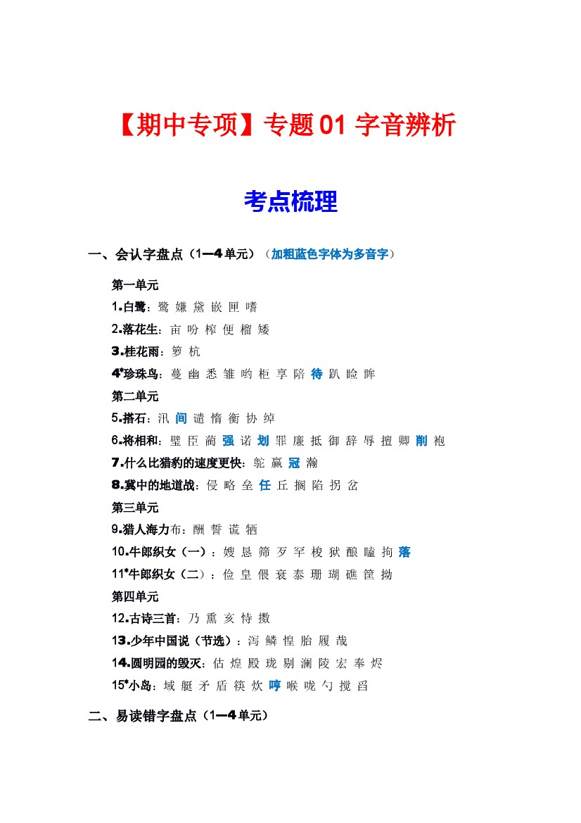 专题 01字音辨析(考点+试题)-2023-2024学年五年级语文上册期中专项复习(统编版)