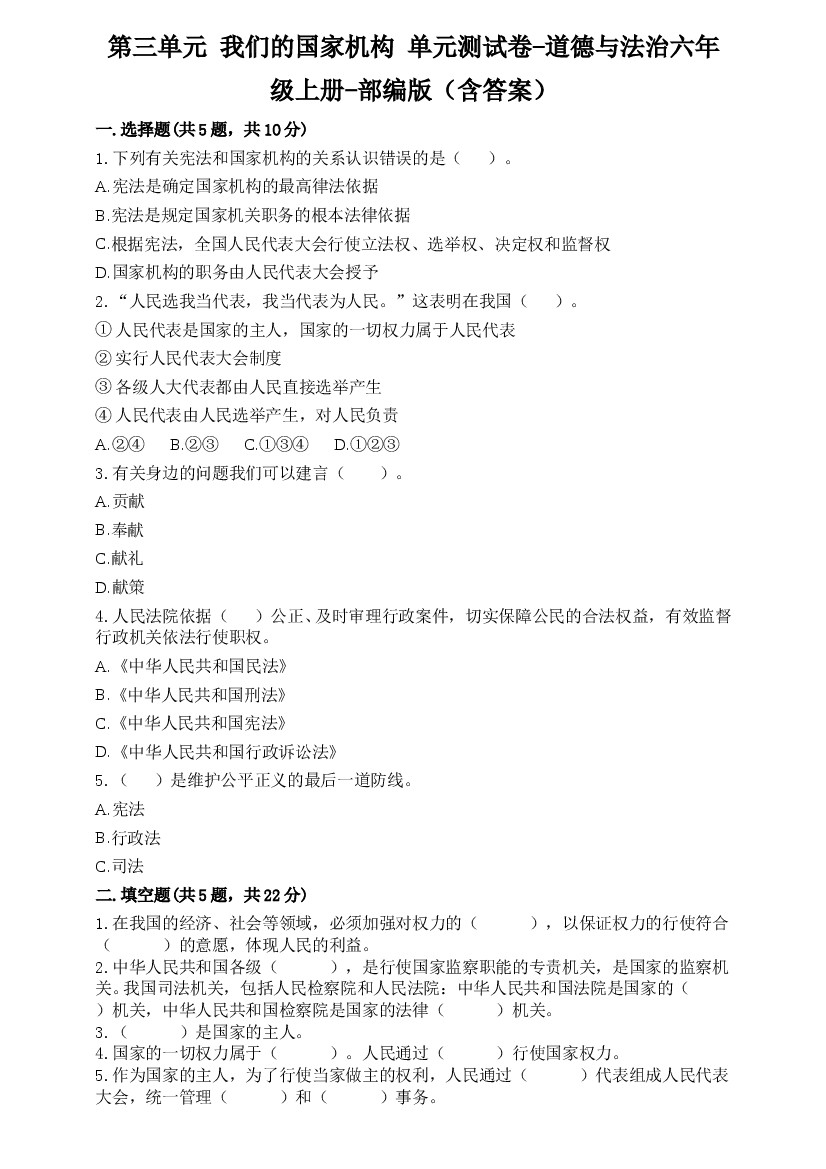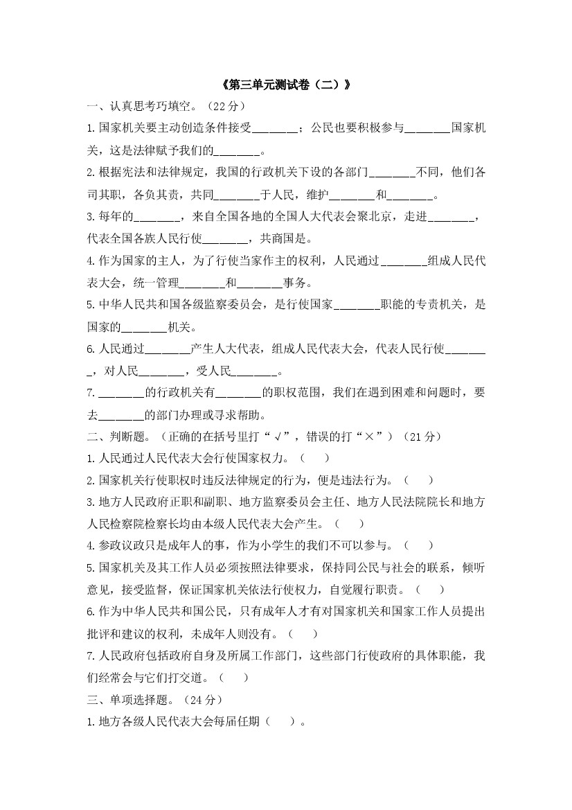 六上丨道法 第3单元测试(5)(部编版)