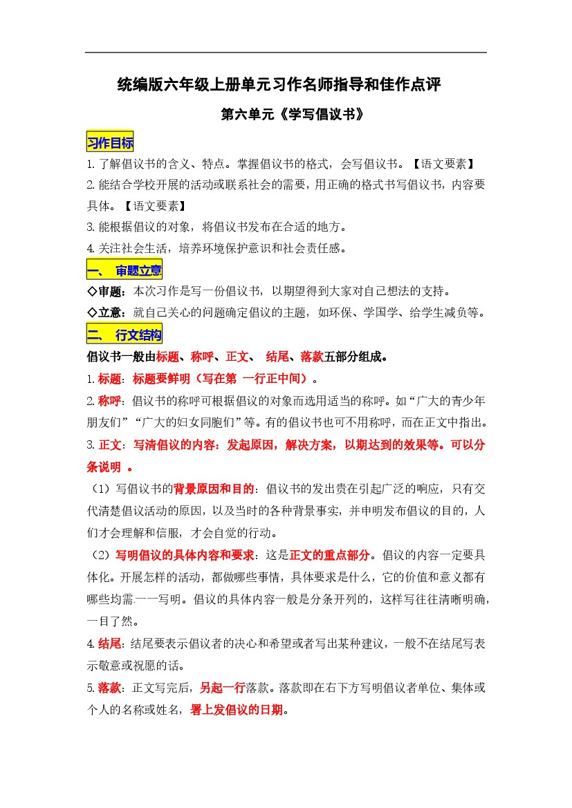 人教部编版六年级语文上册第6单元习作《学写倡议书》名师指导和佳作点评(10篇)