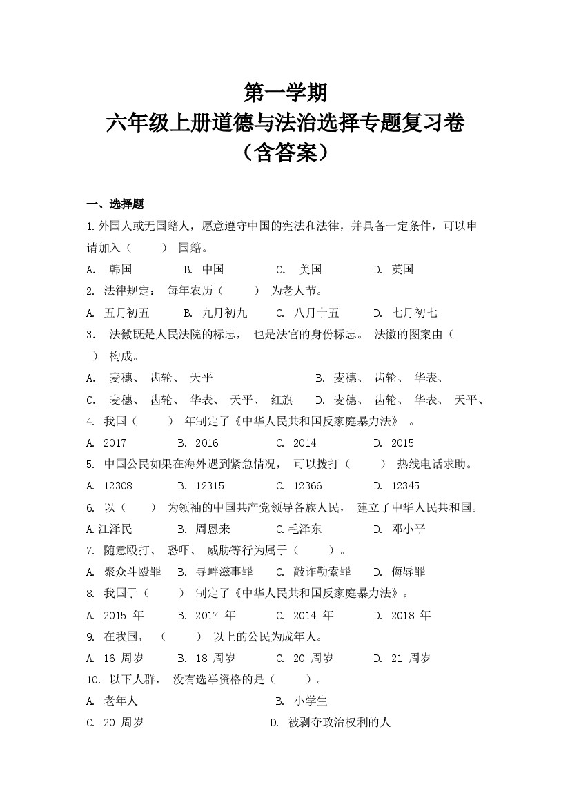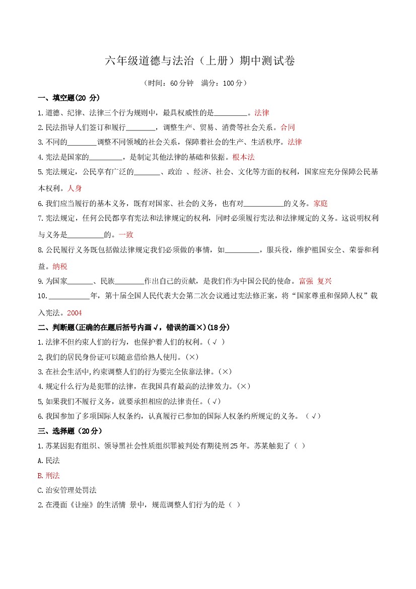 六上道法-期中测试卷(答案版)