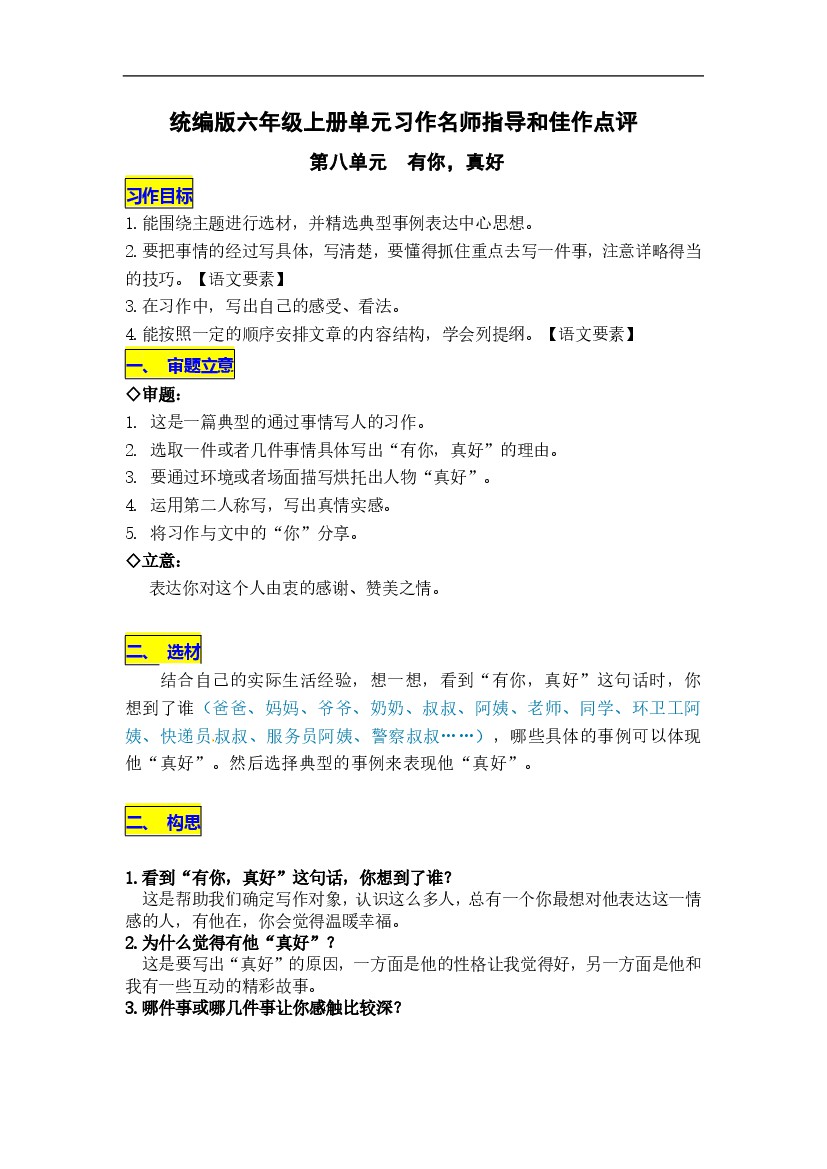 人教部编版六年级语文上册第8单元习作《有你,真好》名师指导和佳作点评(10篇)