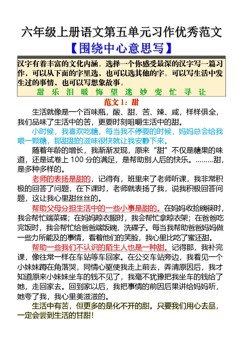 六年上语文第五单元习作优秀范文【围绕中心意思写】