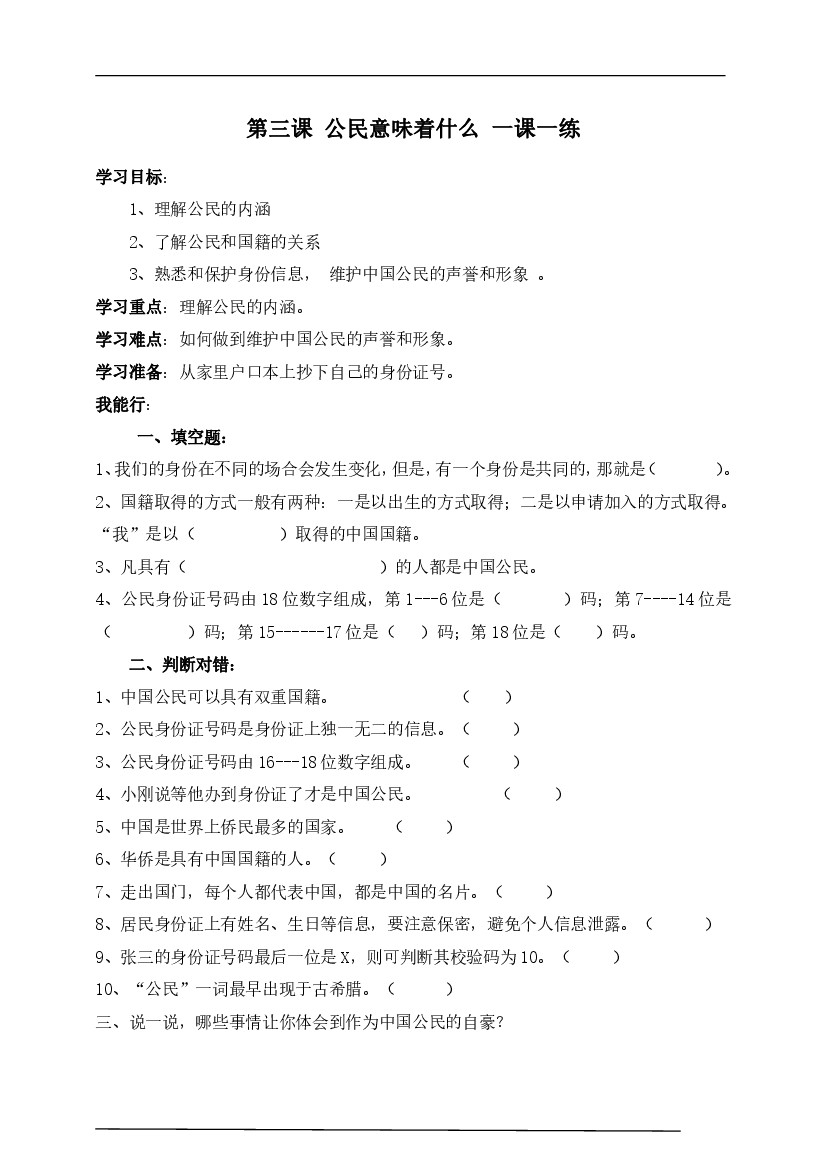 六(上)道德与法治 第3课练习