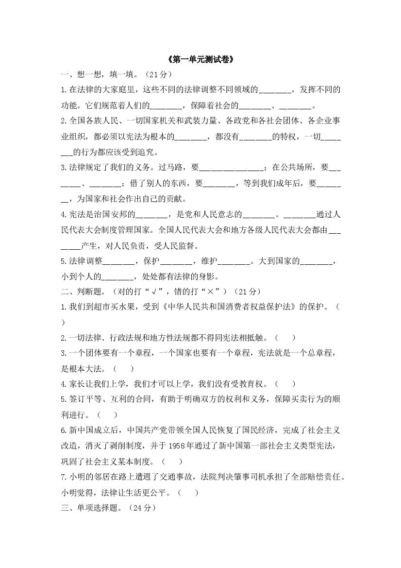 六上丨道法 第3单元测试(1)(部编版)