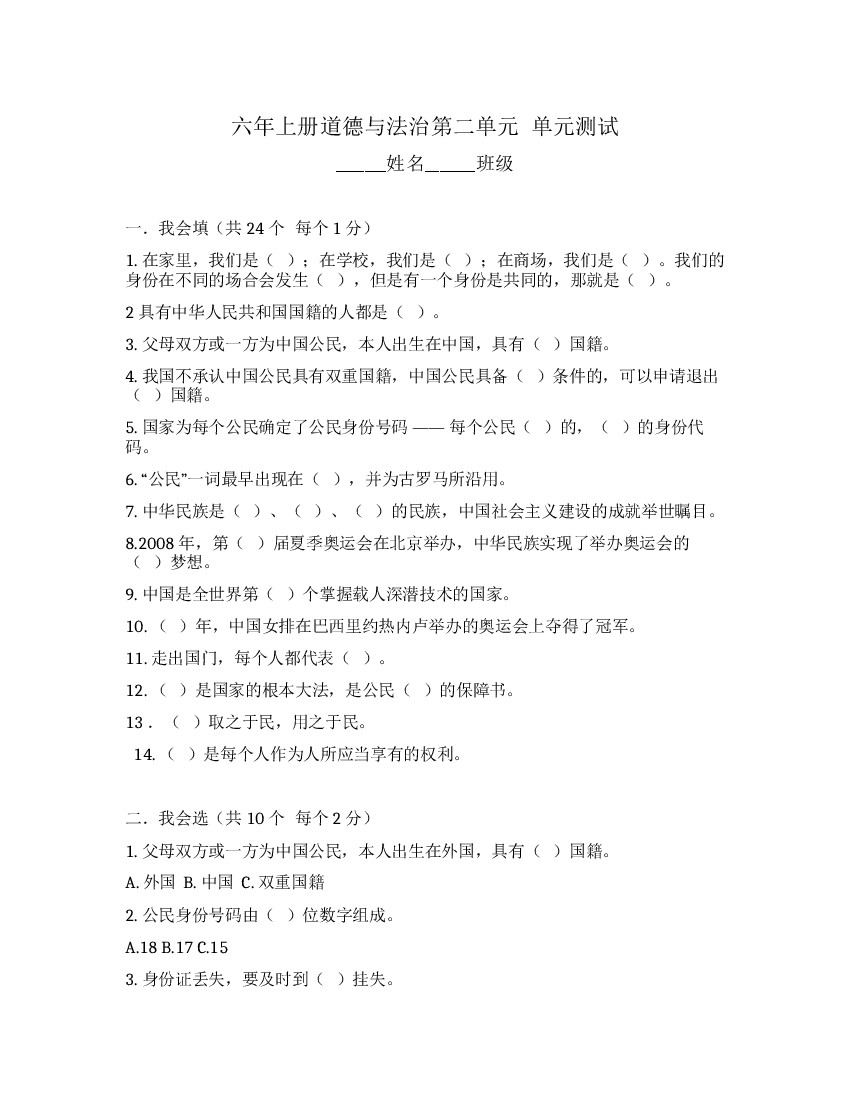 六上丨道法 第2单元测试(4)(部编版)